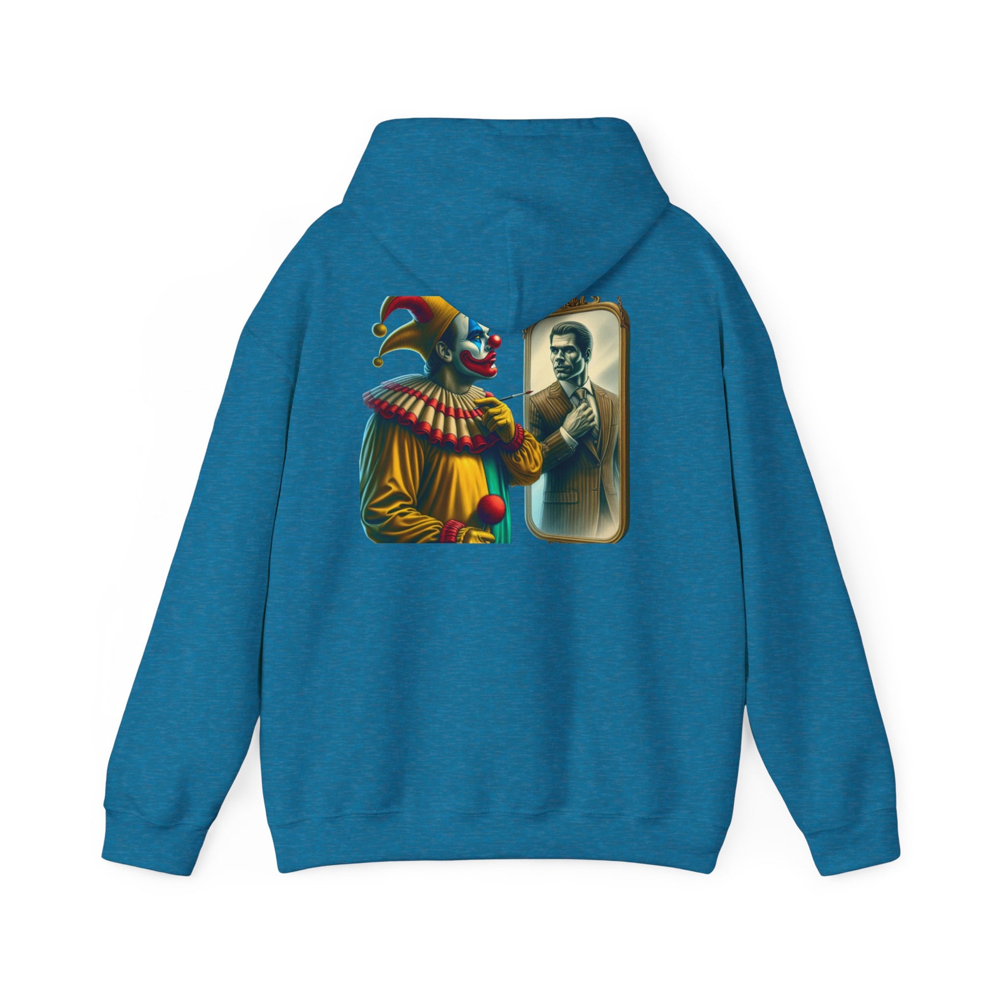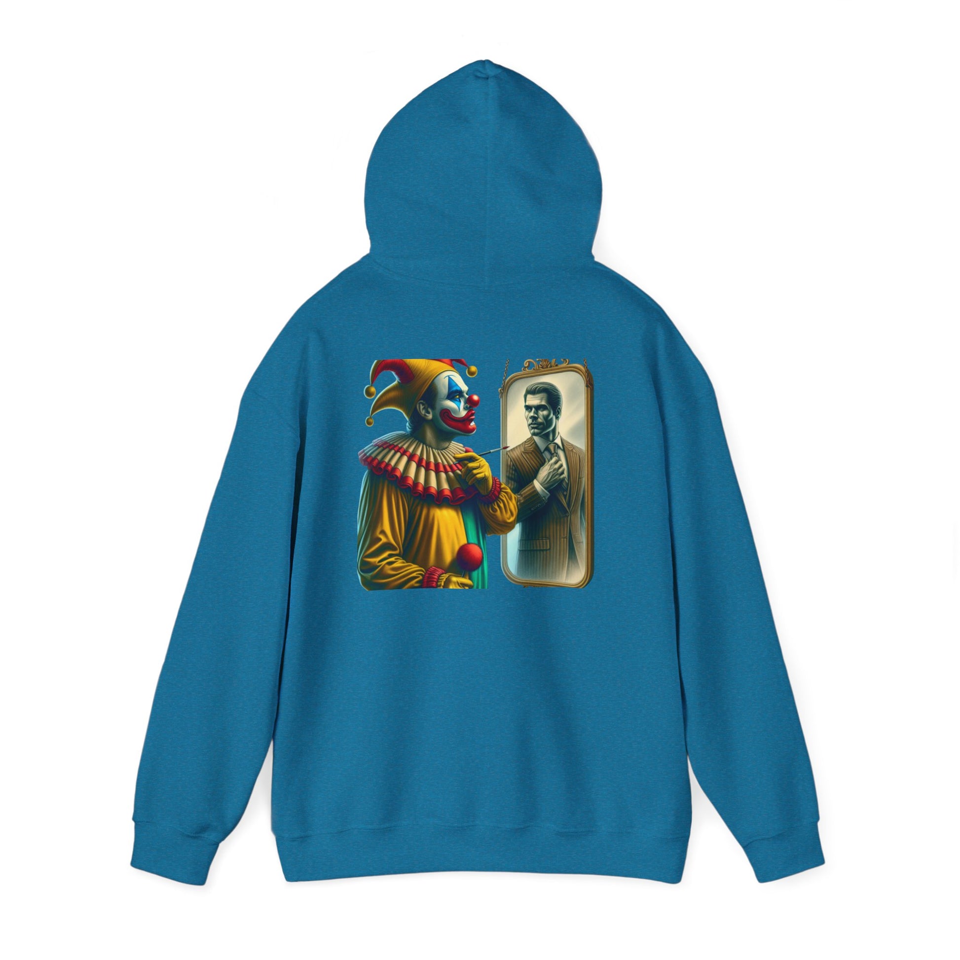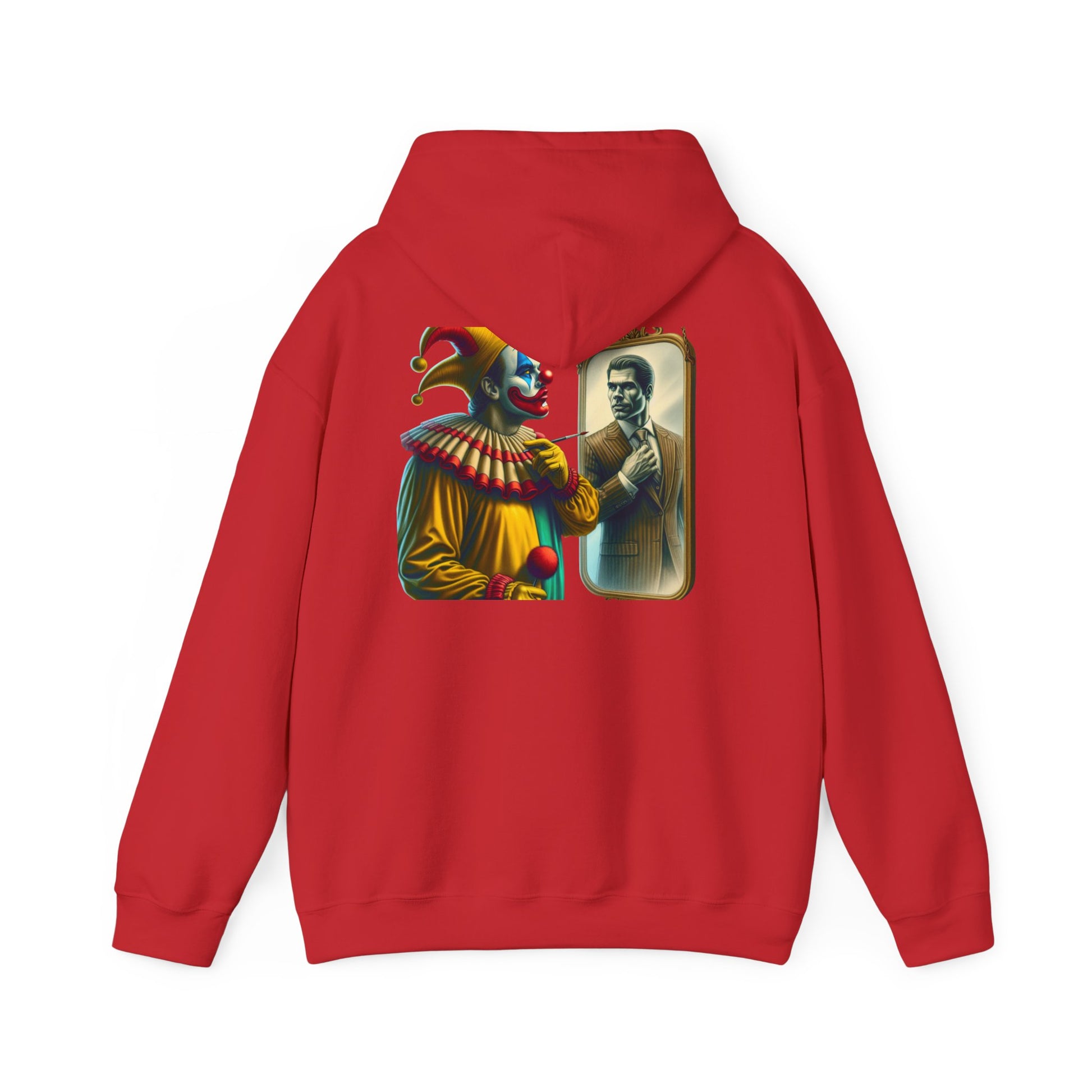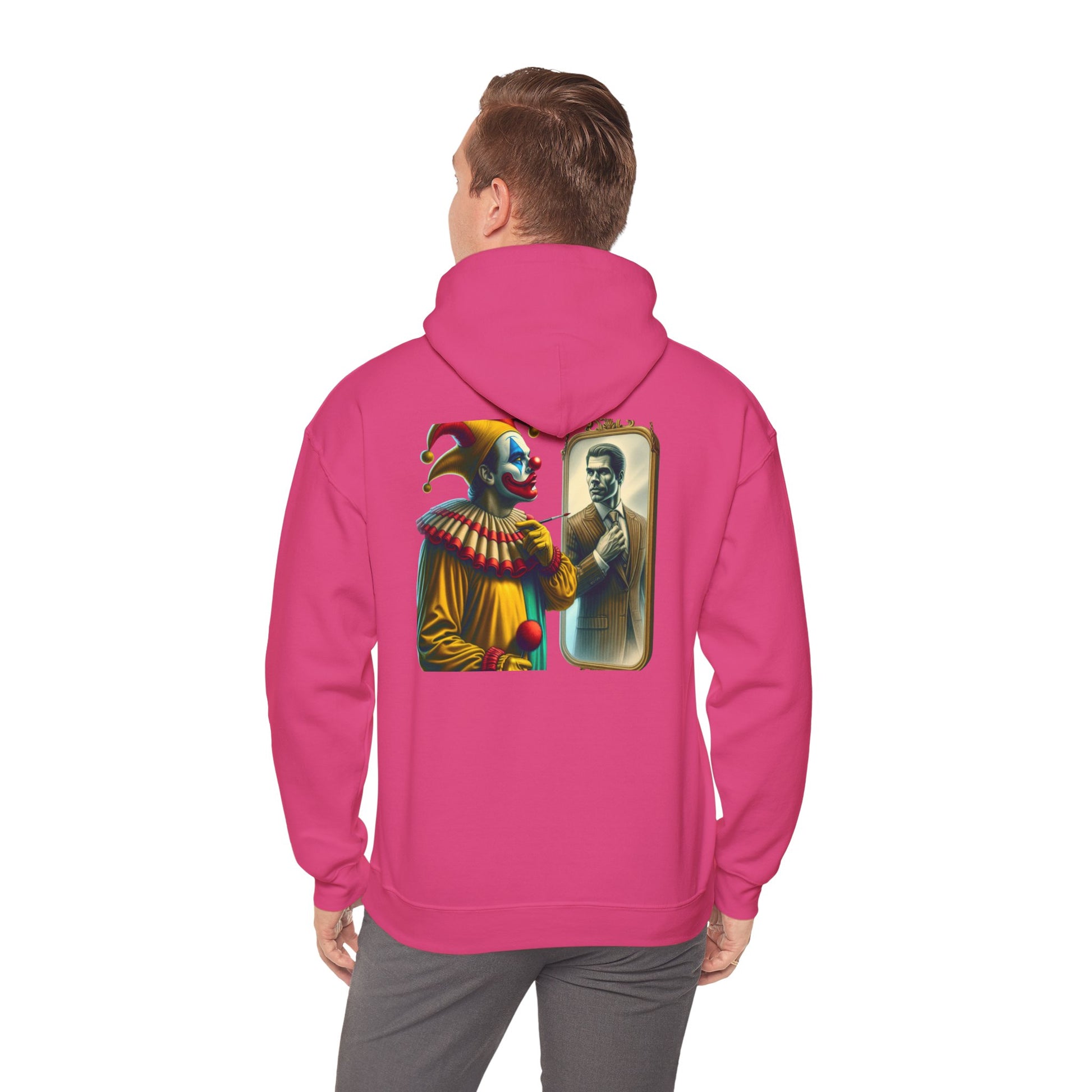 A clown looking in the mirror sees a well-dressed man as a reflection of himself on this multiple colors hoodie. The design adds a touch of whimsy and creativity to your outfit, making it perfect for those who enjoy unique and quirky fashion statements. Ideal for individuals who appreciate playful and artistic designs, this hoodie is great for casual wear, parties, or themed events.