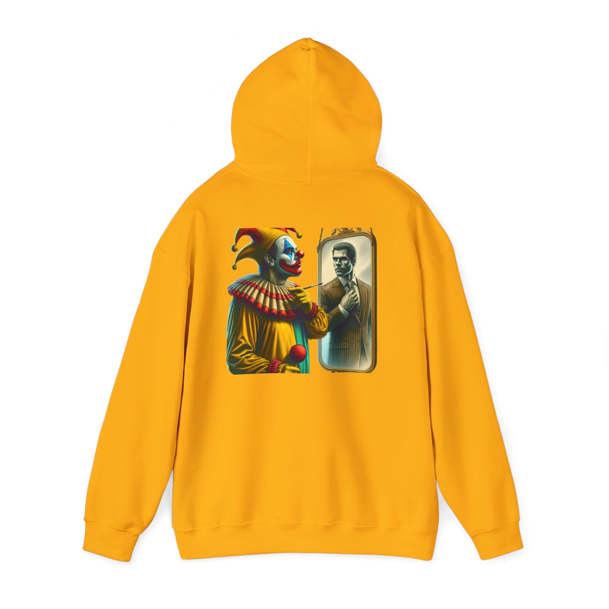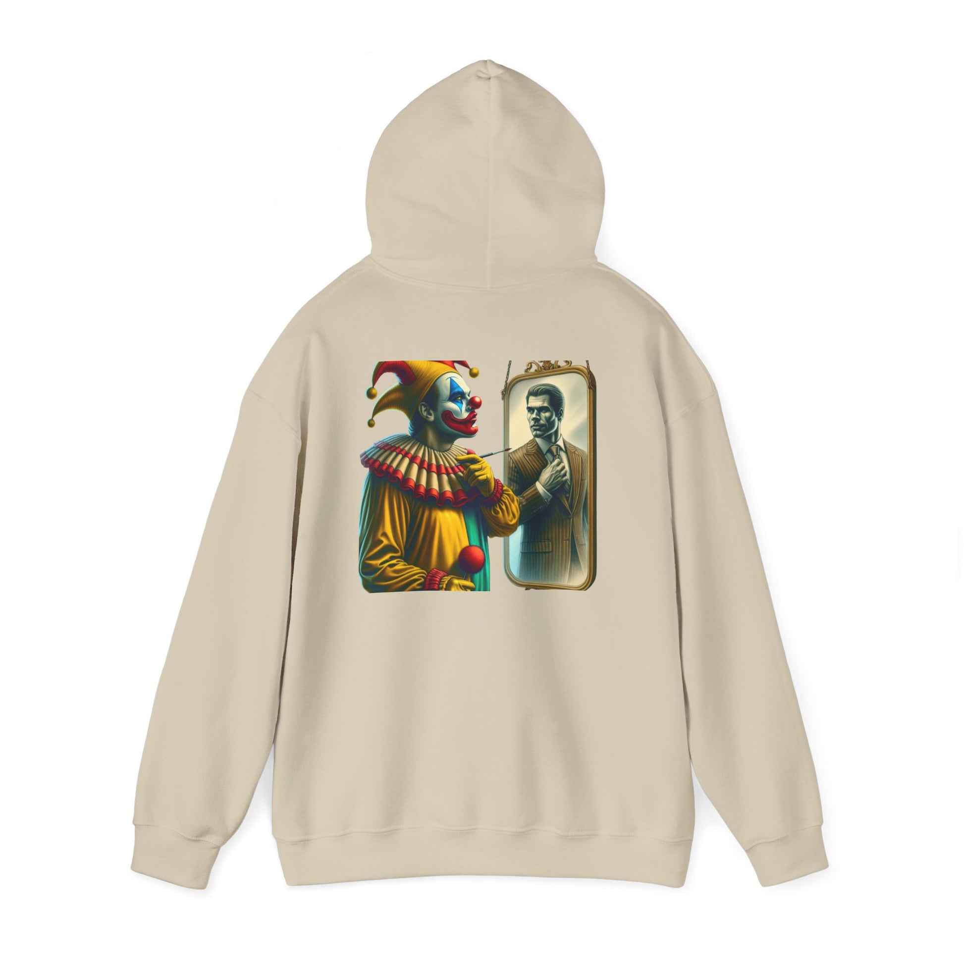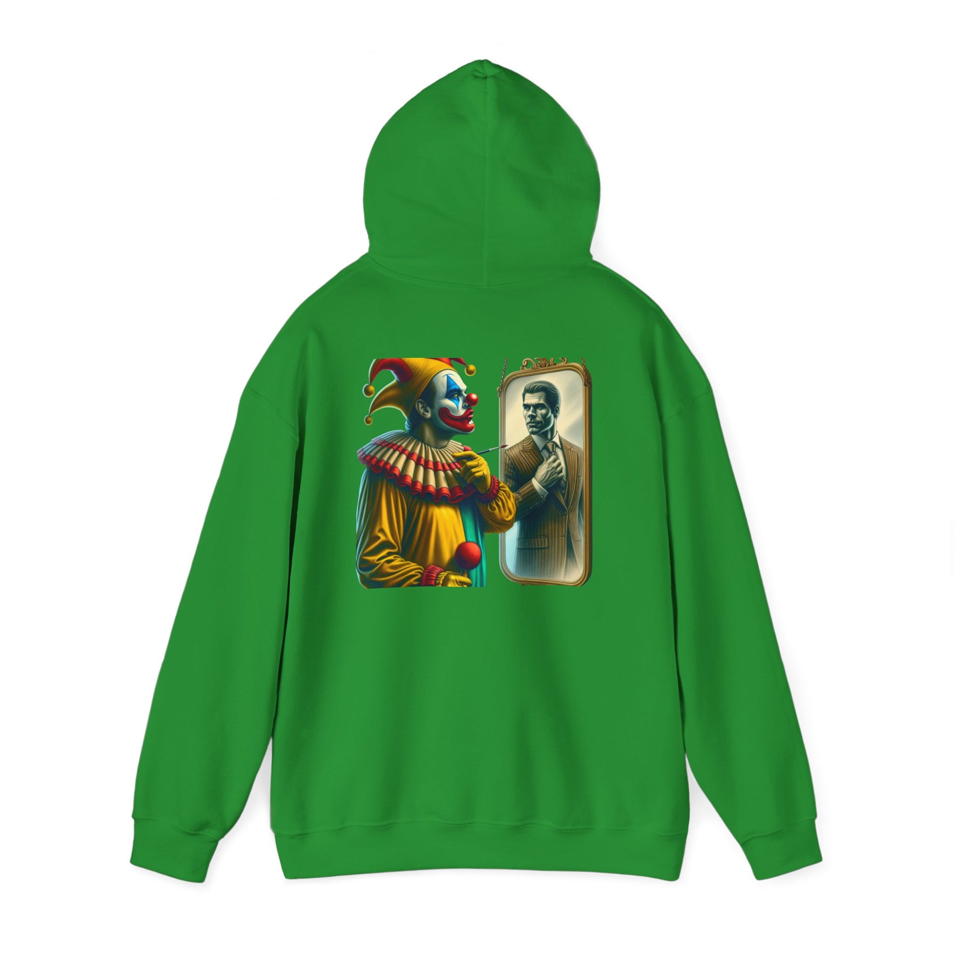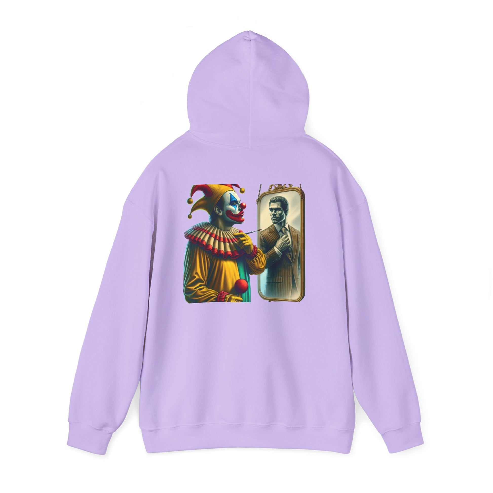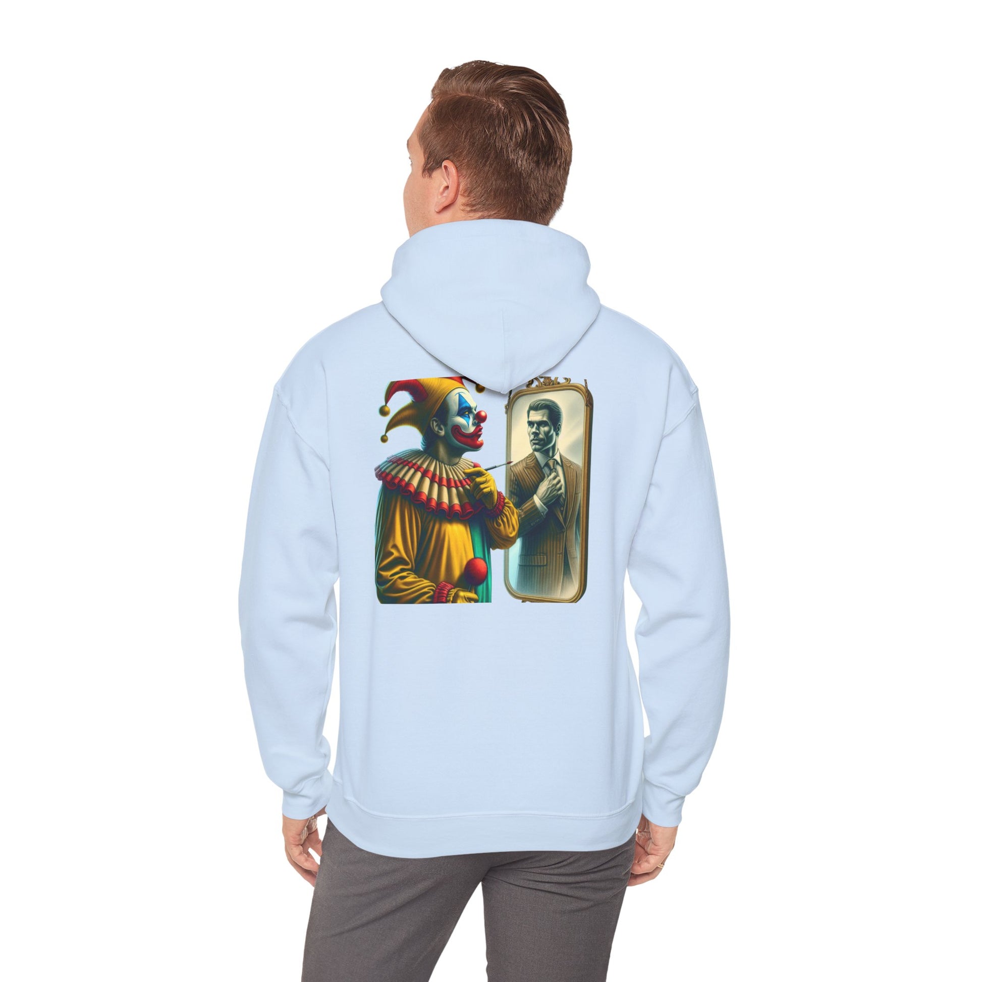 A clown looking in the mirror sees a well-dressed man as a reflection of himself on this multiple colors hoodie. The design adds a touch of whimsy and creativity to your outfit, making it perfect for those who enjoy unique and quirky fashion statements. Ideal for individuals who appreciate playful and artistic designs, this hoodie is great for casual wear, parties, or themed events.