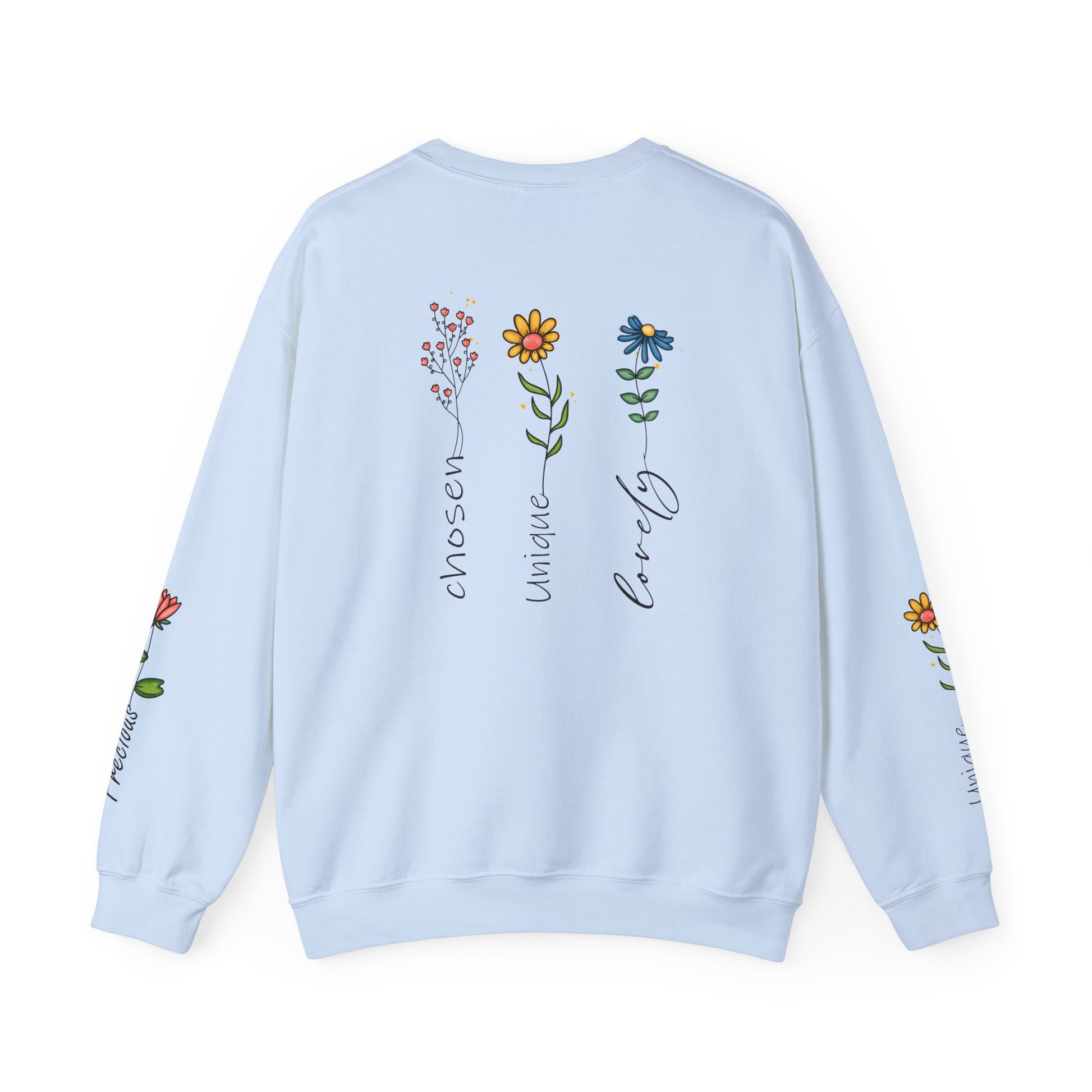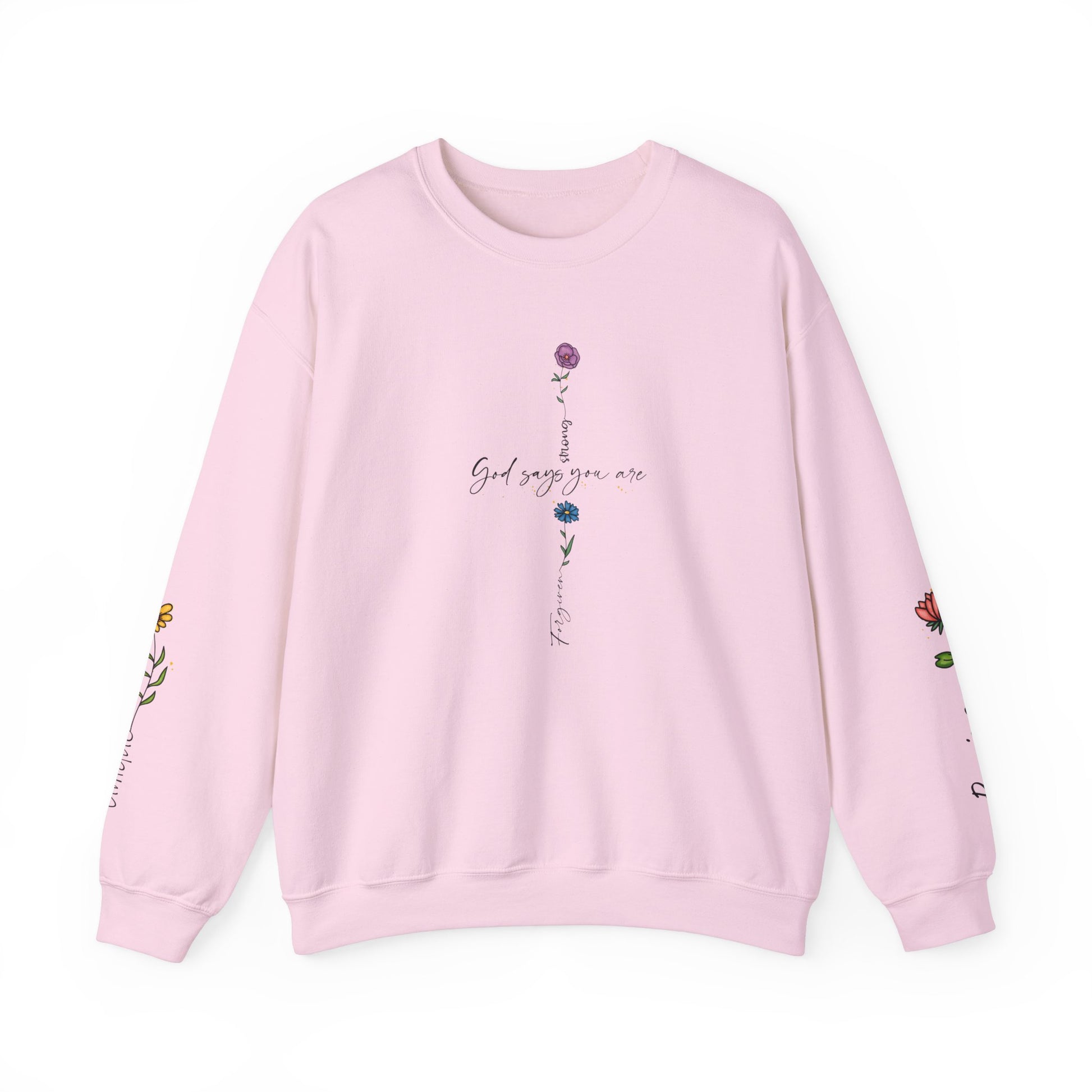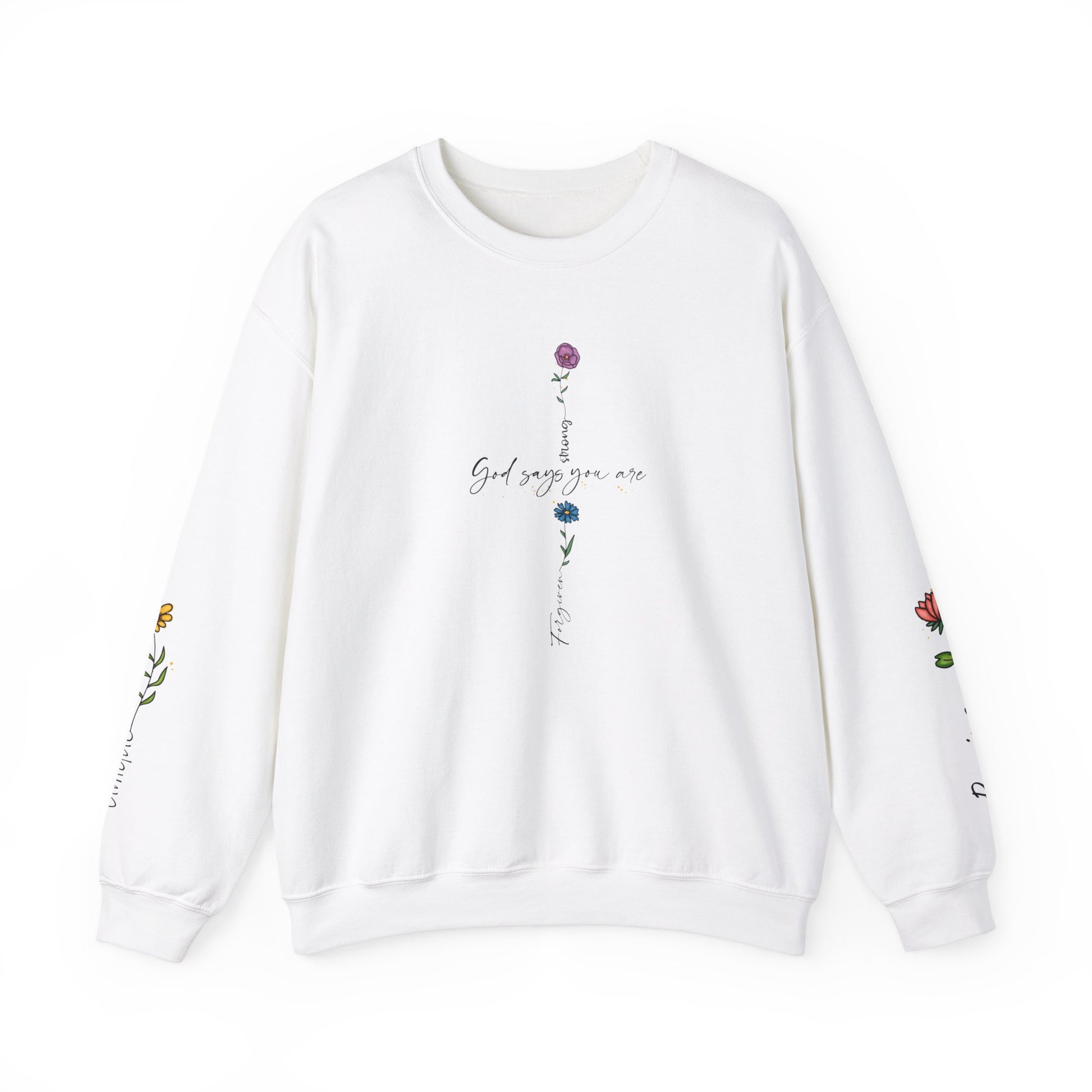 This custom cross design sweatshirt with flowers and feel-good words is perfect for all religious lovers and flower buffs. The words form a cross on the front with more flowers on the sleeves and back, giving a lovely, forgiven, and strong vibe. It's a unique and precious addition to your wardrobe, suitable for colder months.