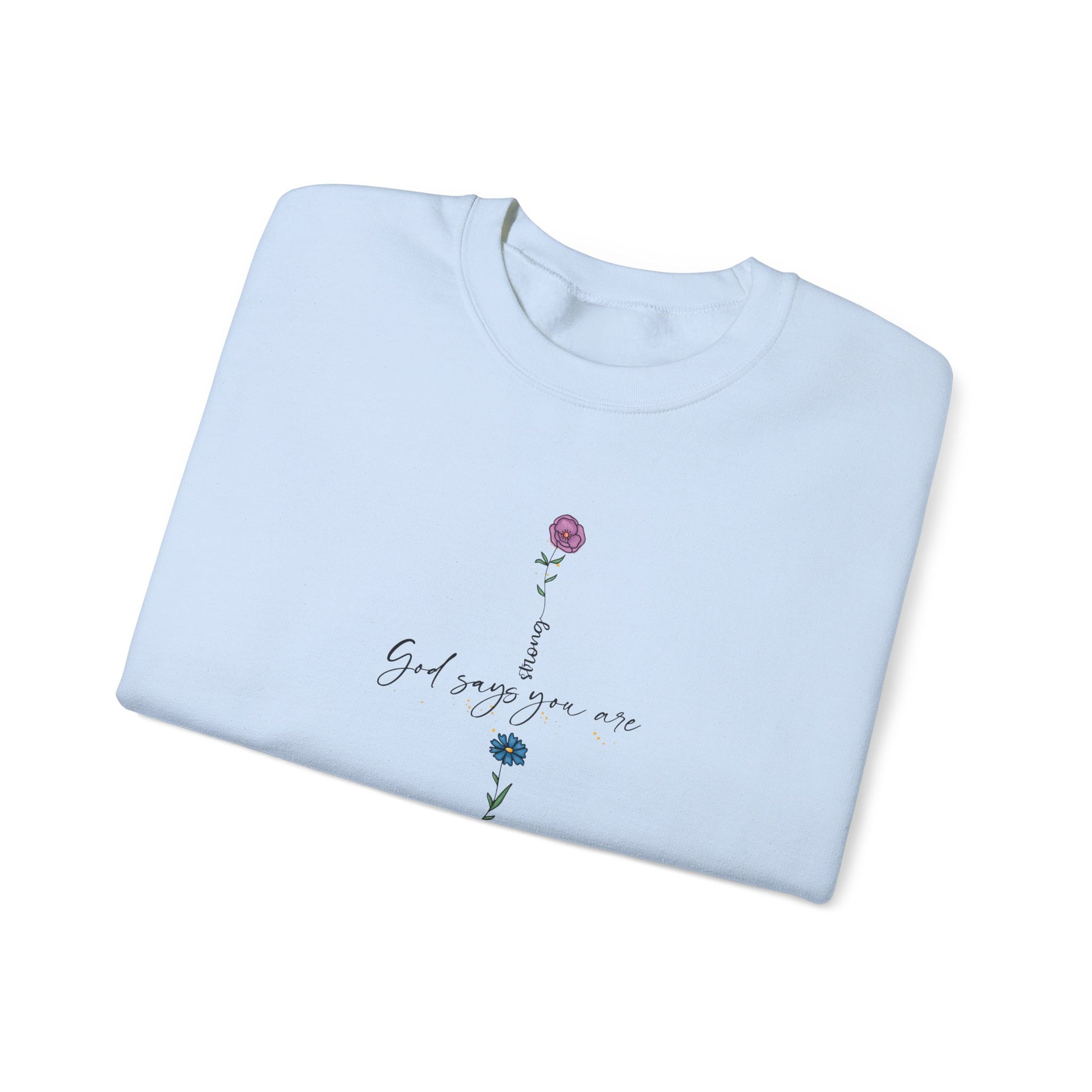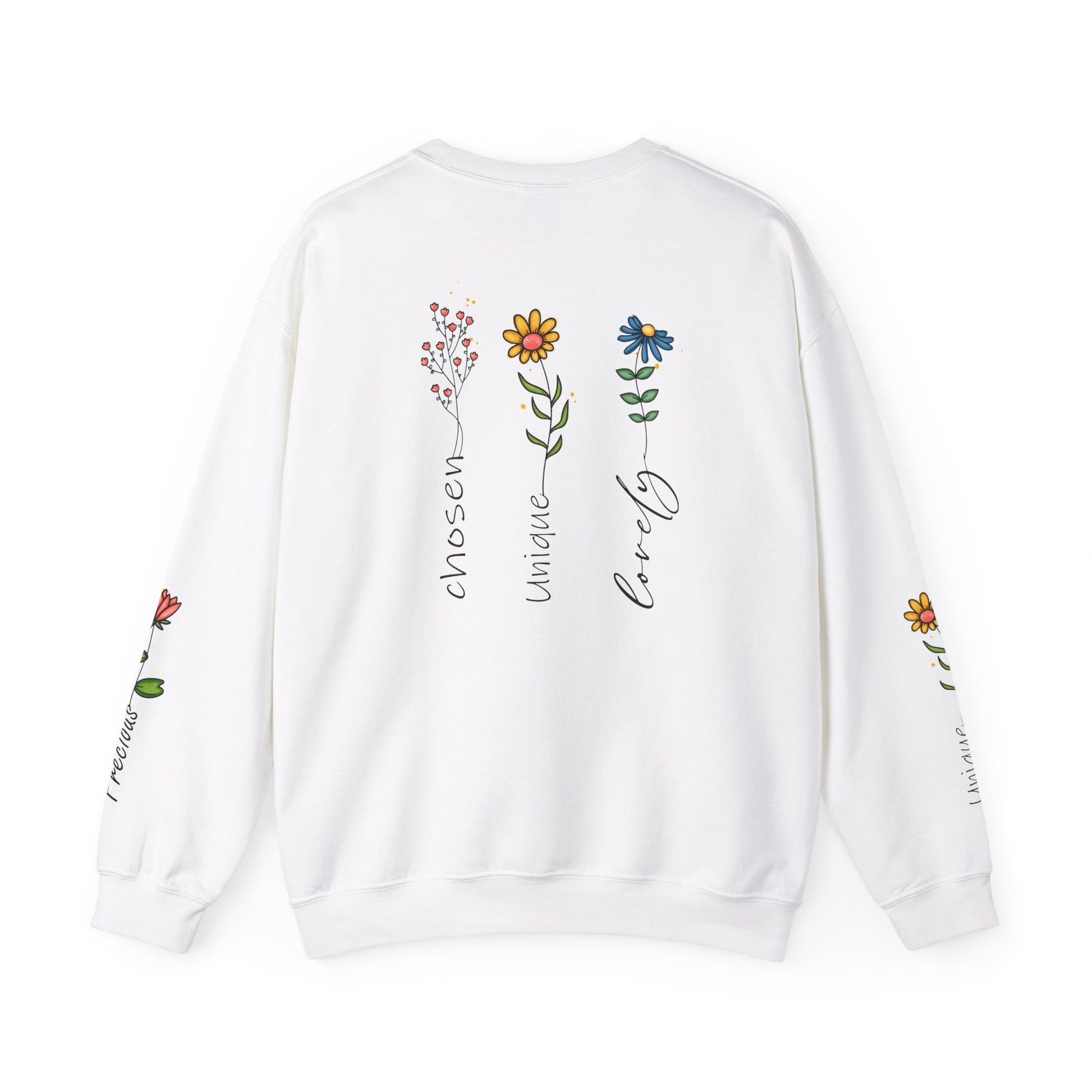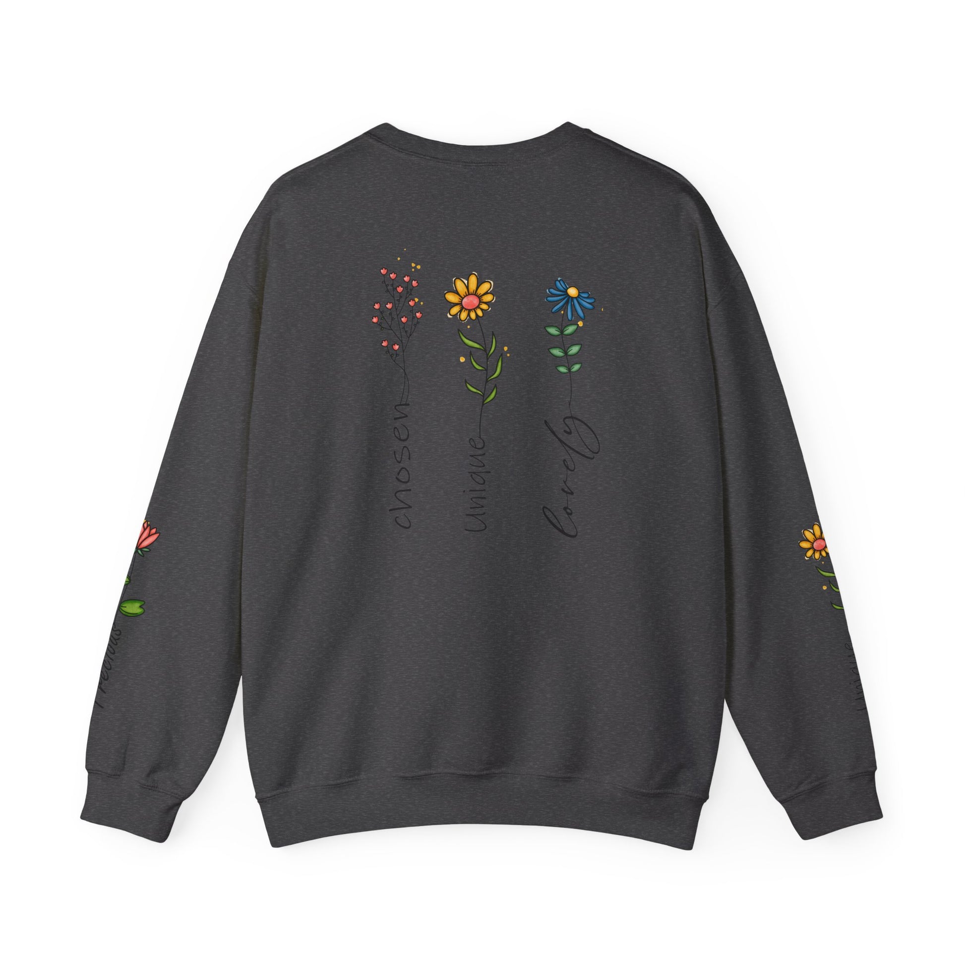 This custom cross design sweatshirt with flowers and feel-good words is perfect for all religious lovers and flower buffs. The words form a cross on the front with more flowers on the sleeves and back, giving a lovely, forgiven, and strong vibe. It's a unique and precious addition to your wardrobe, suitable for colder months.