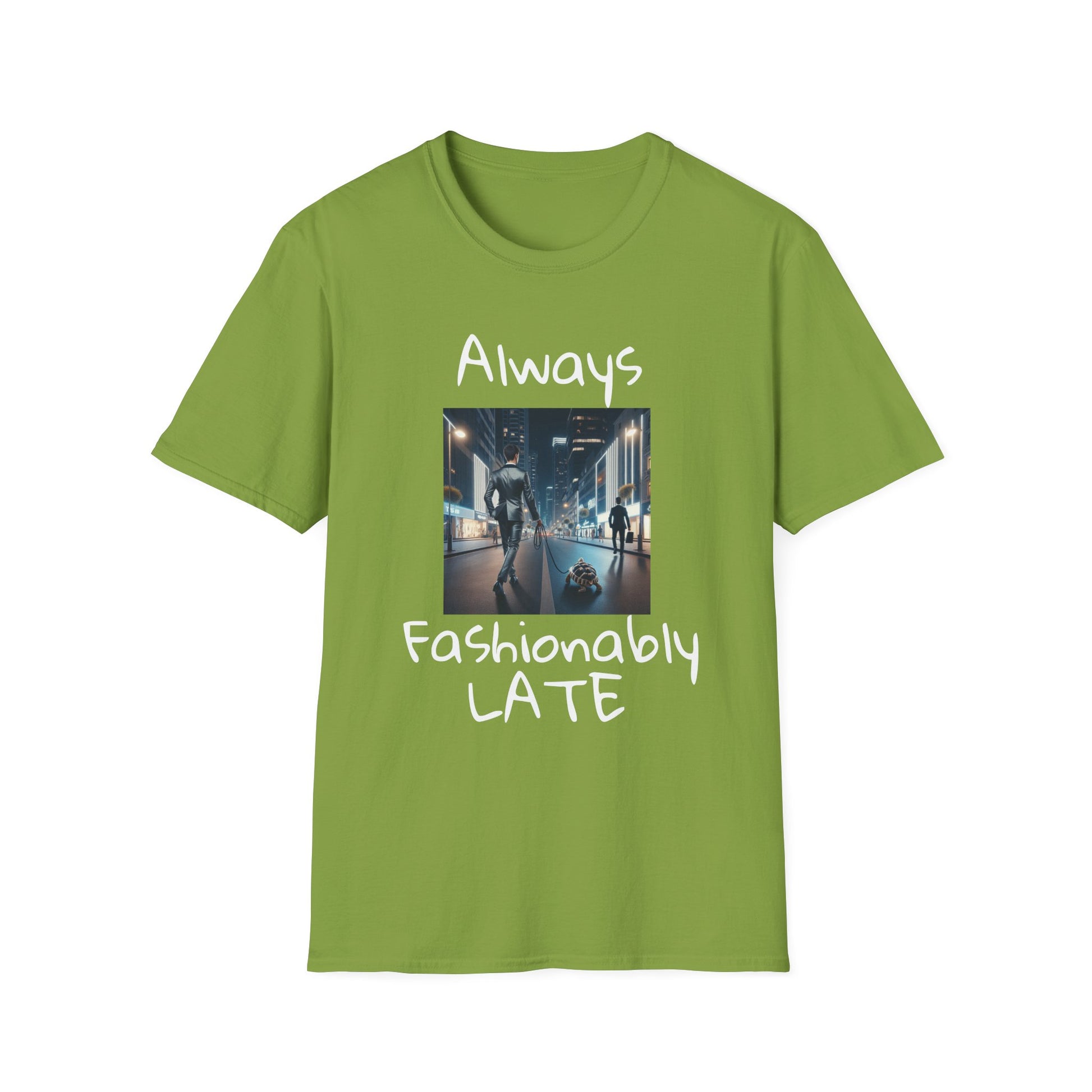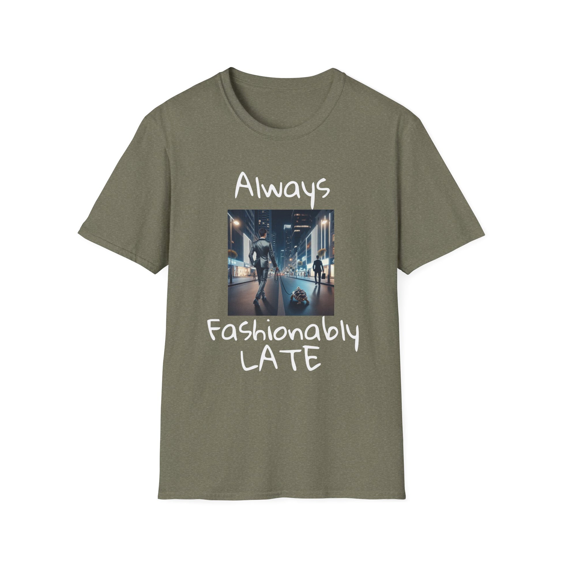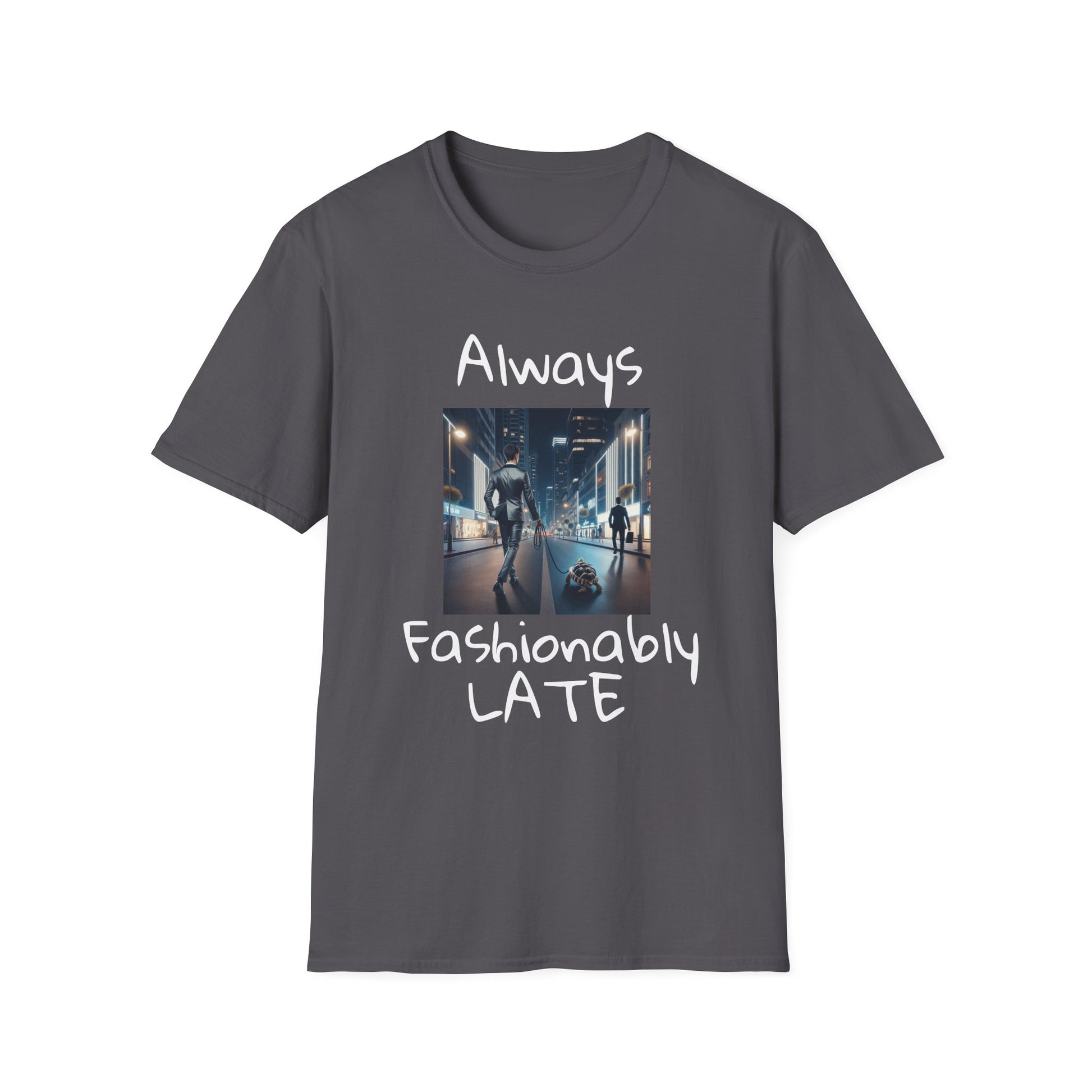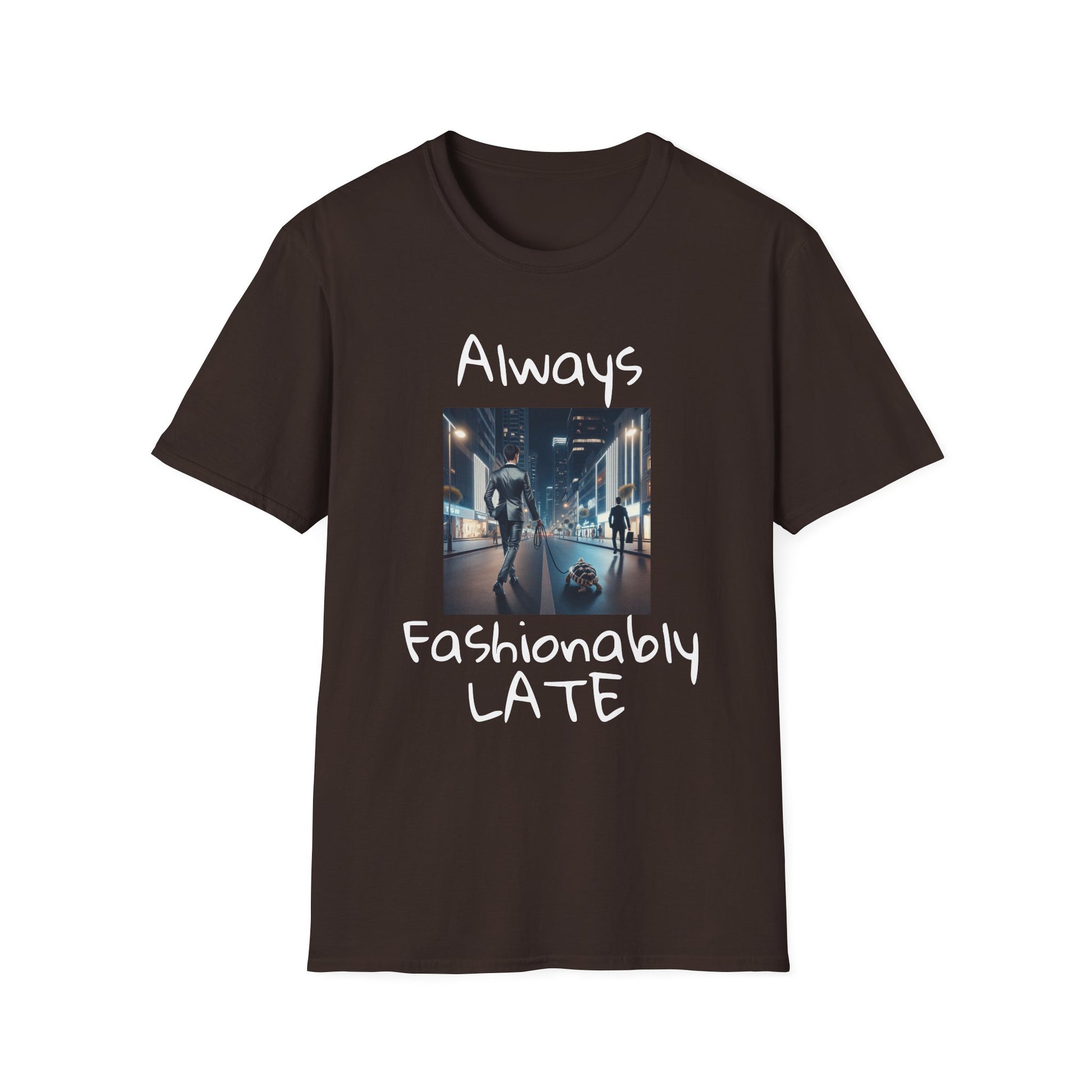 A stylish unisex T-Shirt featuring a picture of a man in a suit walking down a fancy nightlife city street, elegantly walking a tortoise with the saying 'always Fashionably Late'. This shirt gives off a sophisticated and trendy vibe, perfect for fashion-conscious individuals looking to make a statement. Ideal for those who love unique and eye-catching designs, this T-Shirt is perfect for casual outings, parties, and special events.