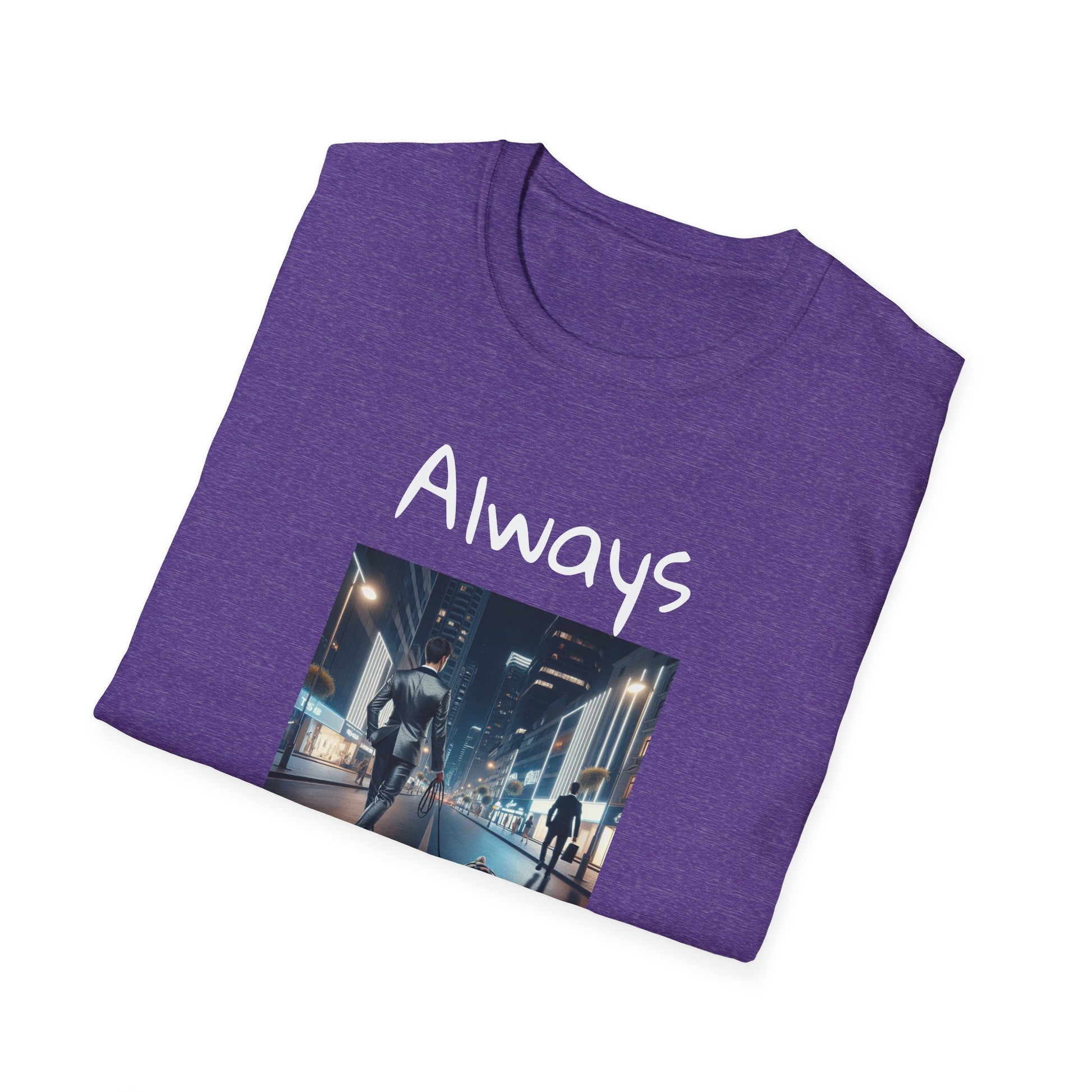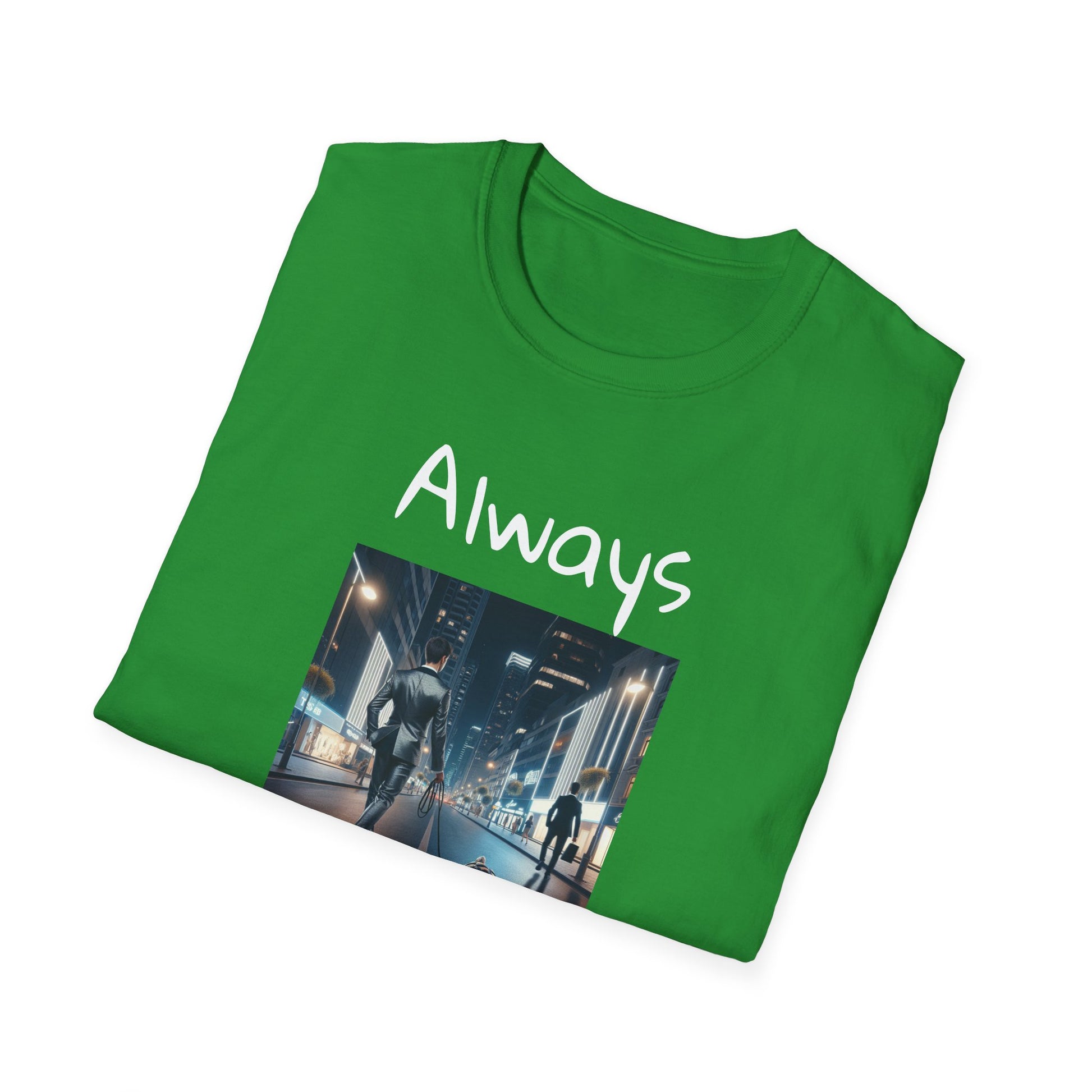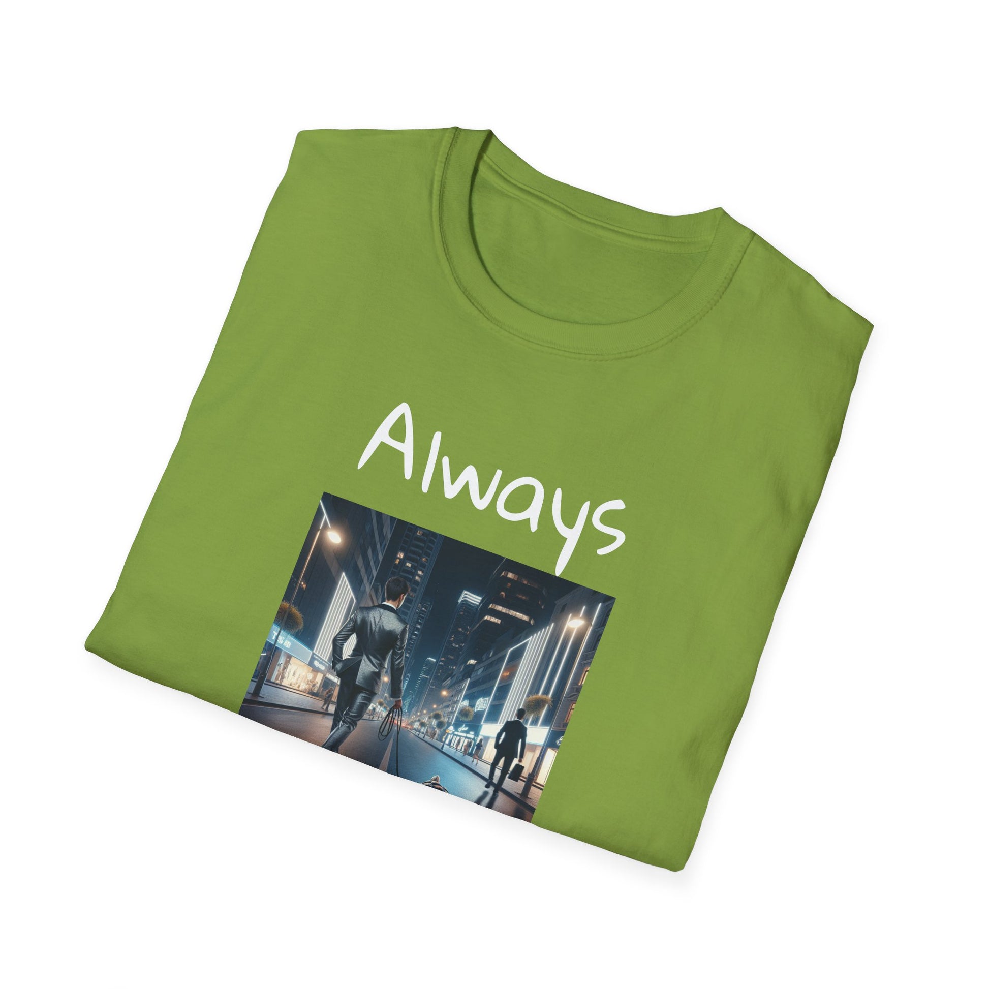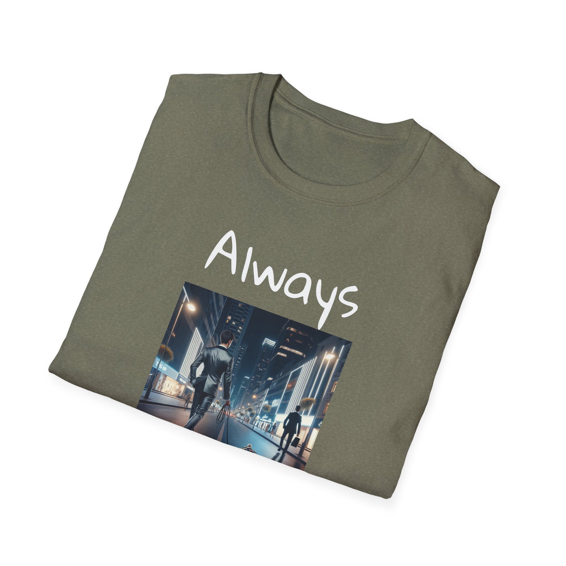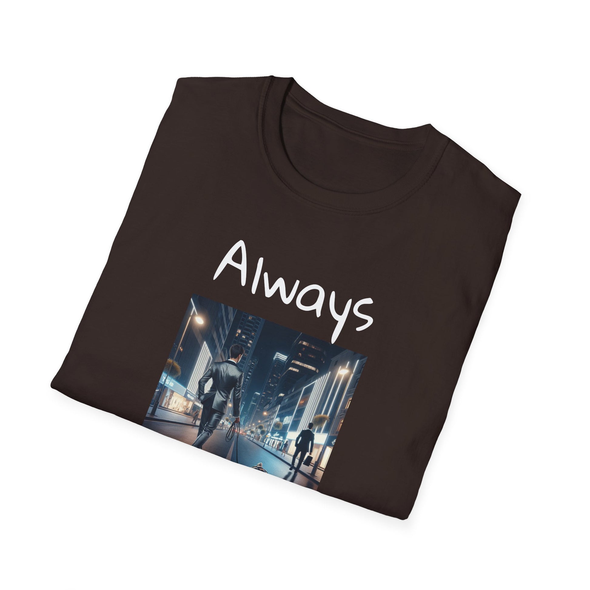 A stylish unisex T-Shirt featuring a picture of a man in a suit walking down a fancy nightlife city street, elegantly walking a tortoise with the saying 'always Fashionably Late'. This shirt gives off a sophisticated and trendy vibe, perfect for fashion-conscious individuals looking to make a statement. Ideal for those who love unique and eye-catching designs, this T-Shirt is perfect for casual outings, parties, and special events.