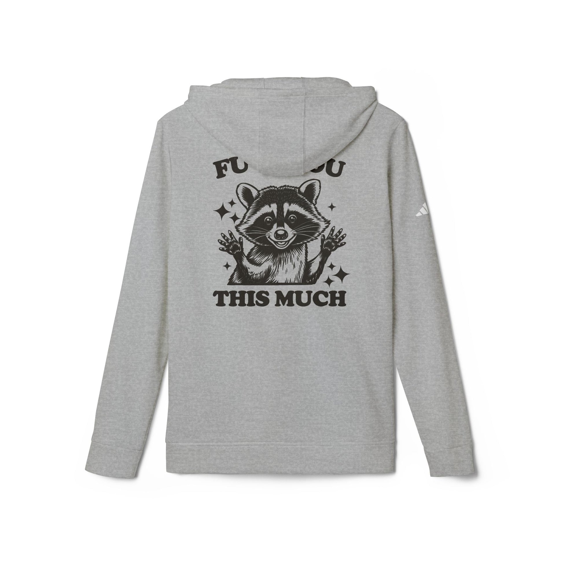 This hoodie features a bold design of a raccoon holding his hands out indicating size with a surrounding quote saying 'FU*K You This Much'. The image is black set on different colors on the back, while the front is plain with pockets. It gives off a playful and edgy vibe, perfect for casual streetwear. This hoodie is relevant for those who enjoy unique and expressive clothing, and it is suitable for occasions where a statement piece is needed.