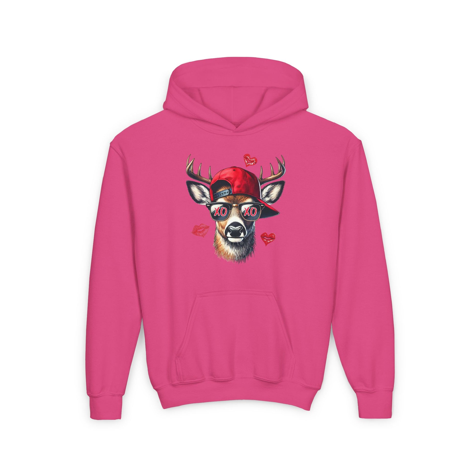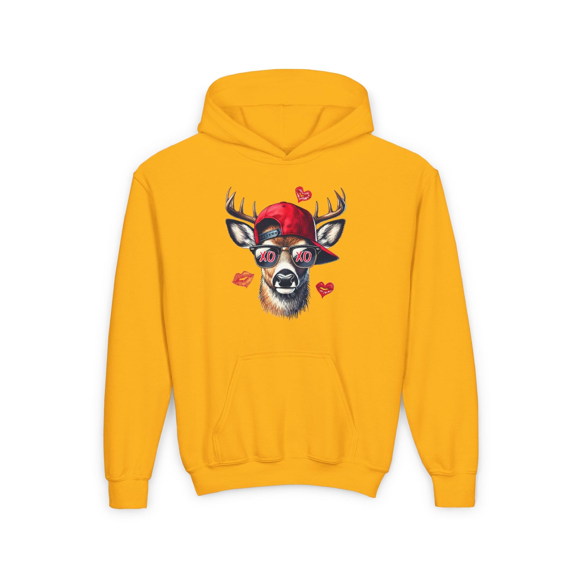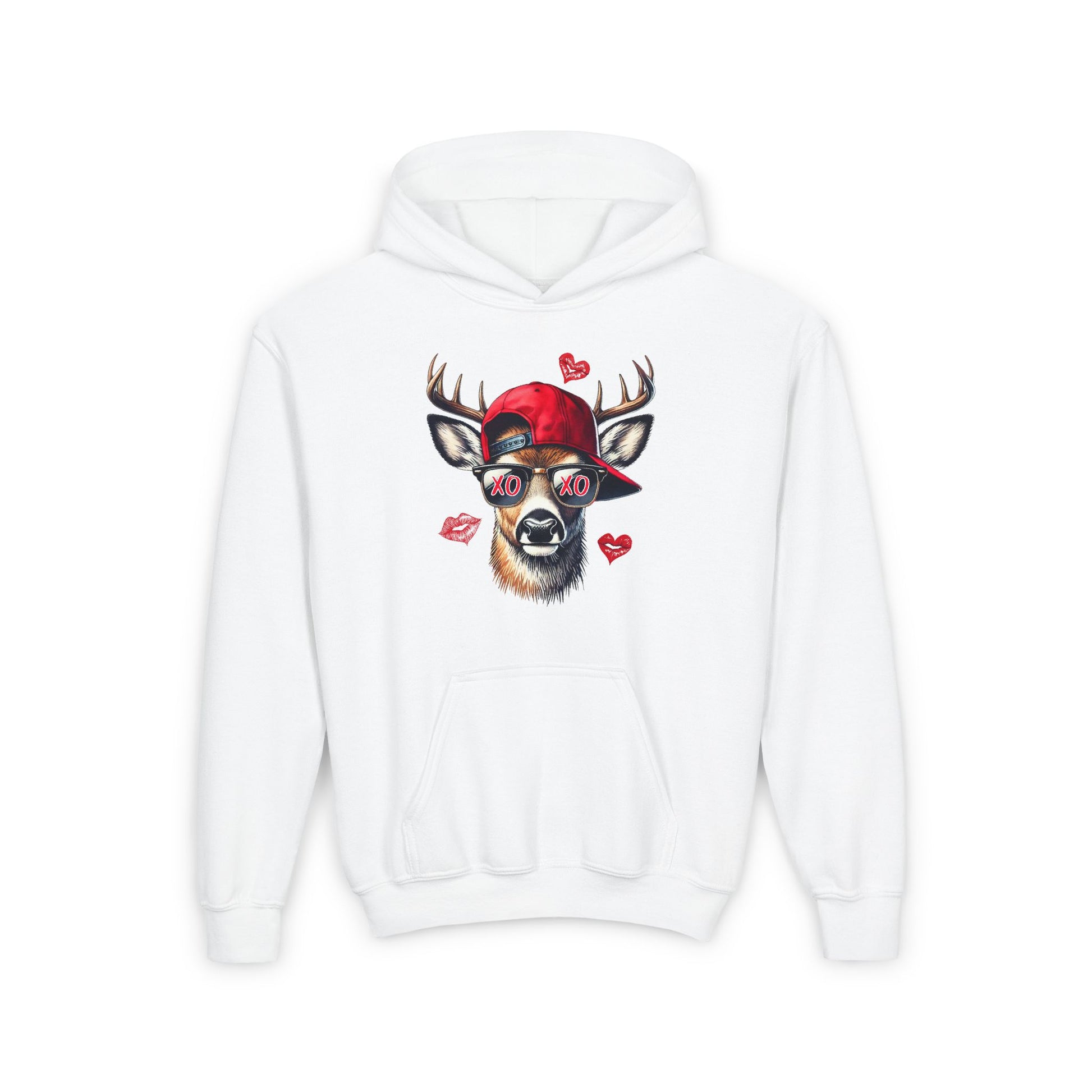 A trendy and stylish hoodie featuring a unique design of a buck head with sunglasses, surrounded by lips and hearts. Perfect for young individuals looking to make a fashion statement. Ideal for casual wear or as a gift for teenagers on Valentine's Day or as a fun addition to their wardrobe.
