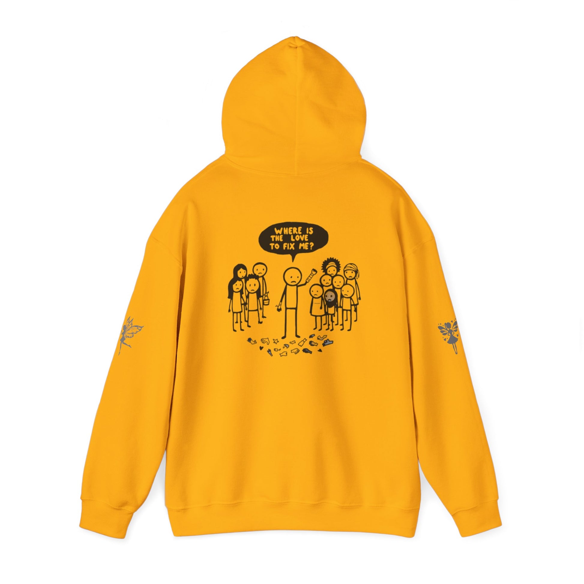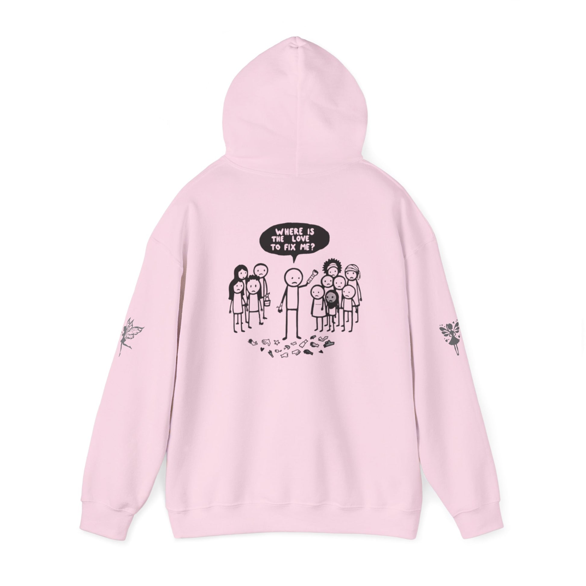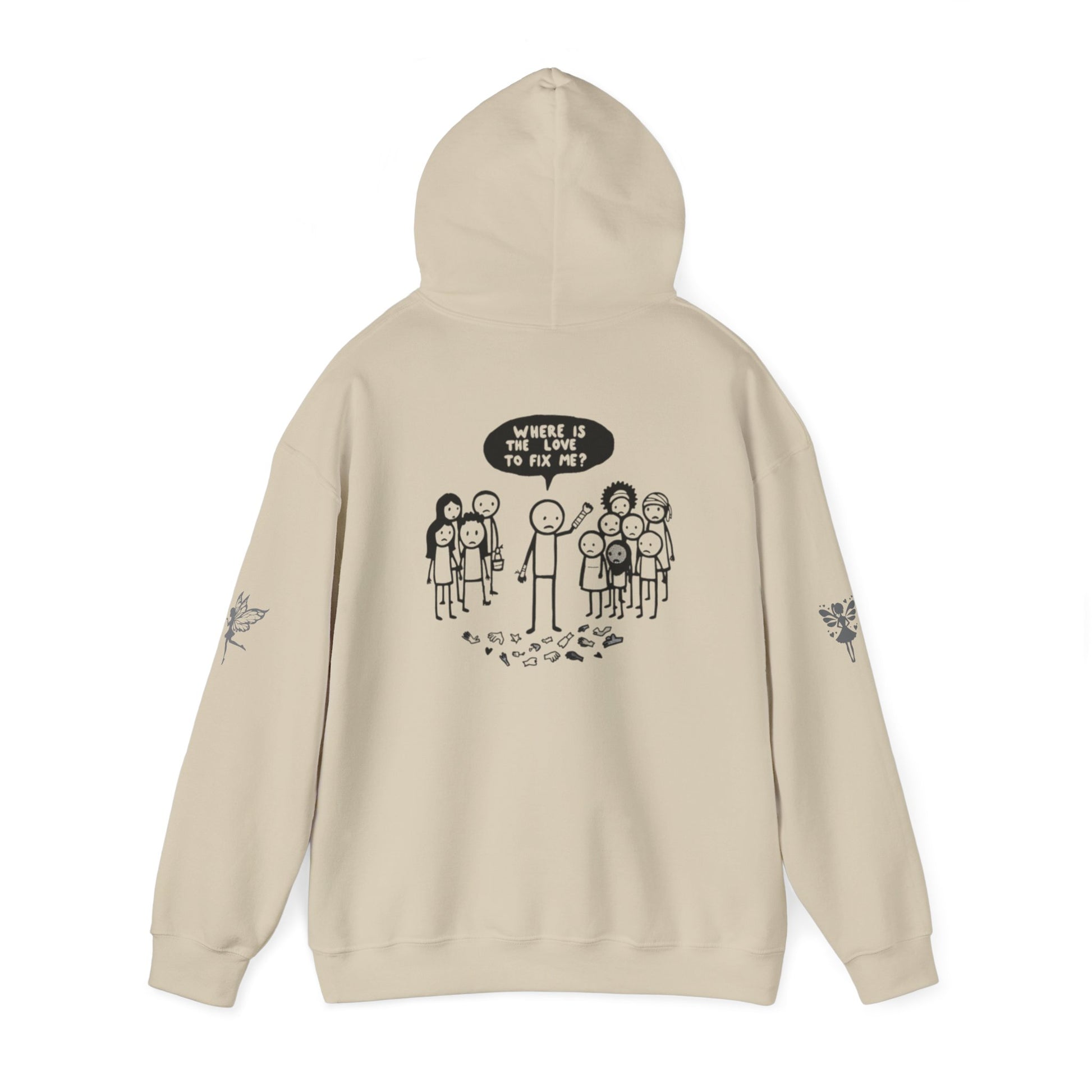 A cozy and warm hoodie featuring a design of a broken stick figure asking who can fix them, standing with a broken arm surrounded by others. Perfect for those looking for a unique and artistic addition to their wardrobe. Ideal for adults looking for comfortable and stylish clothing. Relevant for casual wear, holidays, and everyday occasions.