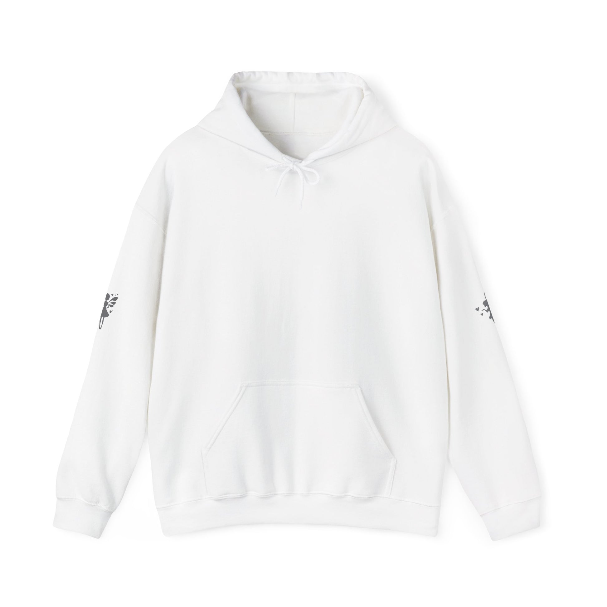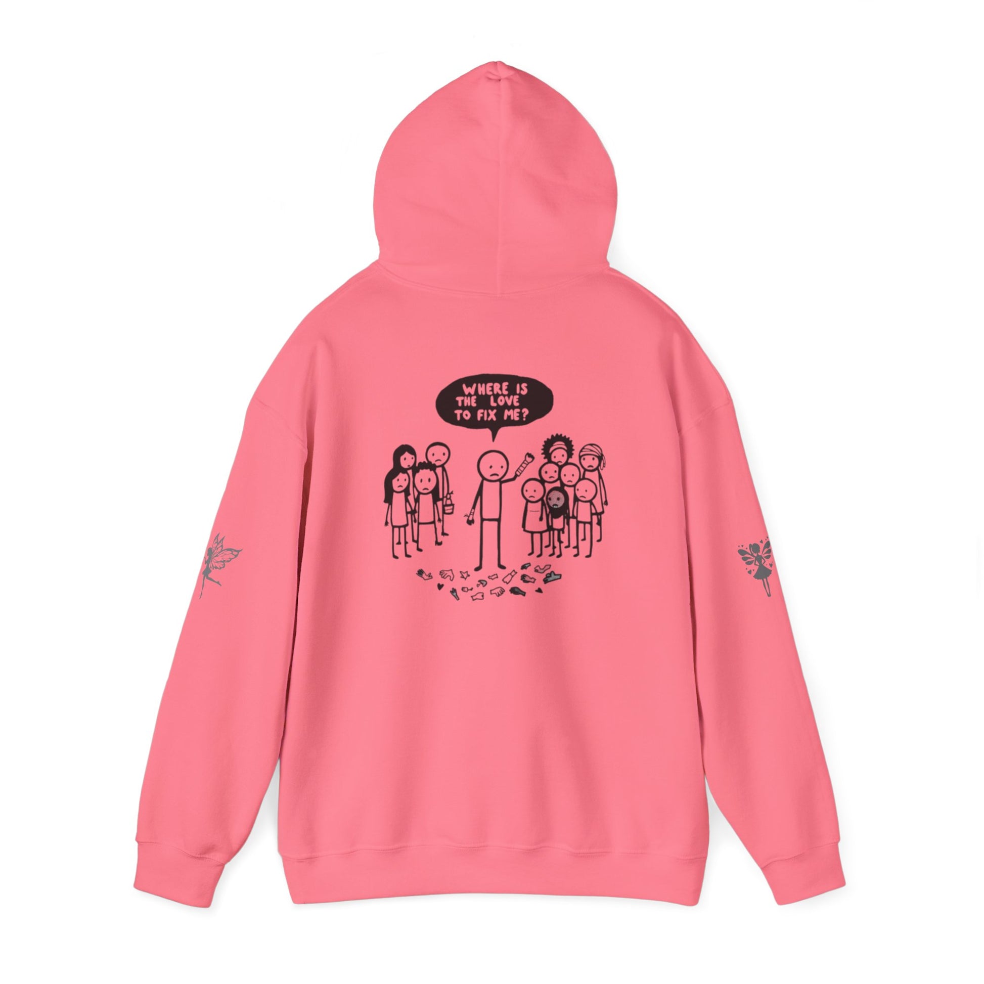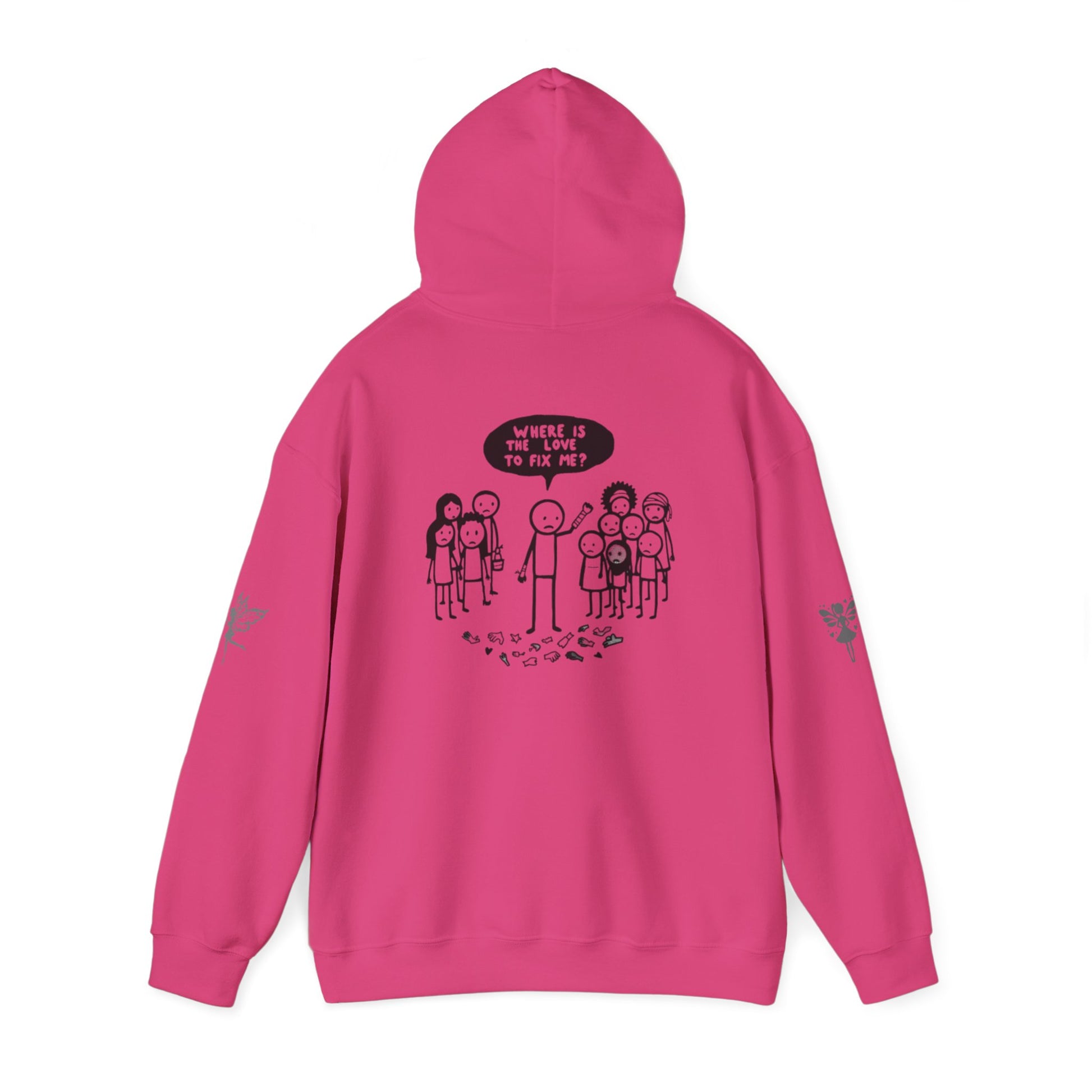 A cozy and warm hoodie featuring a design of a broken stick figure asking who can fix them, standing with a broken arm surrounded by others. Perfect for those looking for a unique and artistic addition to their wardrobe. Ideal for adults looking for comfortable and stylish clothing. Relevant for casual wear, holidays, and everyday occasions.