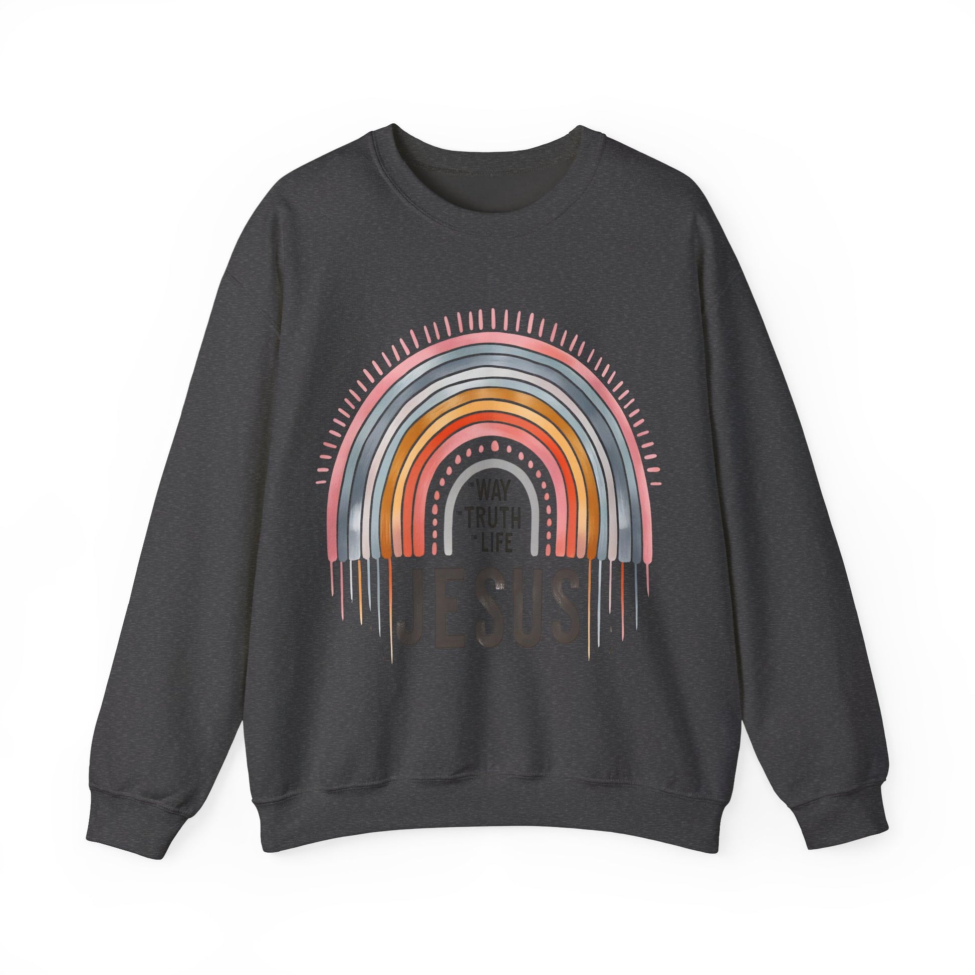 Introducing a cozy Unisex Crewneck Sweatshirt that radiates comfort and style. Perfect for chilly days, this classic fit sweatshirt features a vibrant rainbow design with a bold message: "Way, Truth, Life, Jesus". It’s more than just apparel; it’s an expression of faith and positivity. Ideal for those who cherish spiritual connections, this sweatshirt is designed for adults, making it a meaningful gift for friends and family during the holidays, religious celebrations, or casual outings. Wear it to Sunday services, family gatherings, or cozy nights in, and let it inspire uplifting conversations among loved ones. Embrace warmth and style while spreading a message of love and hope!