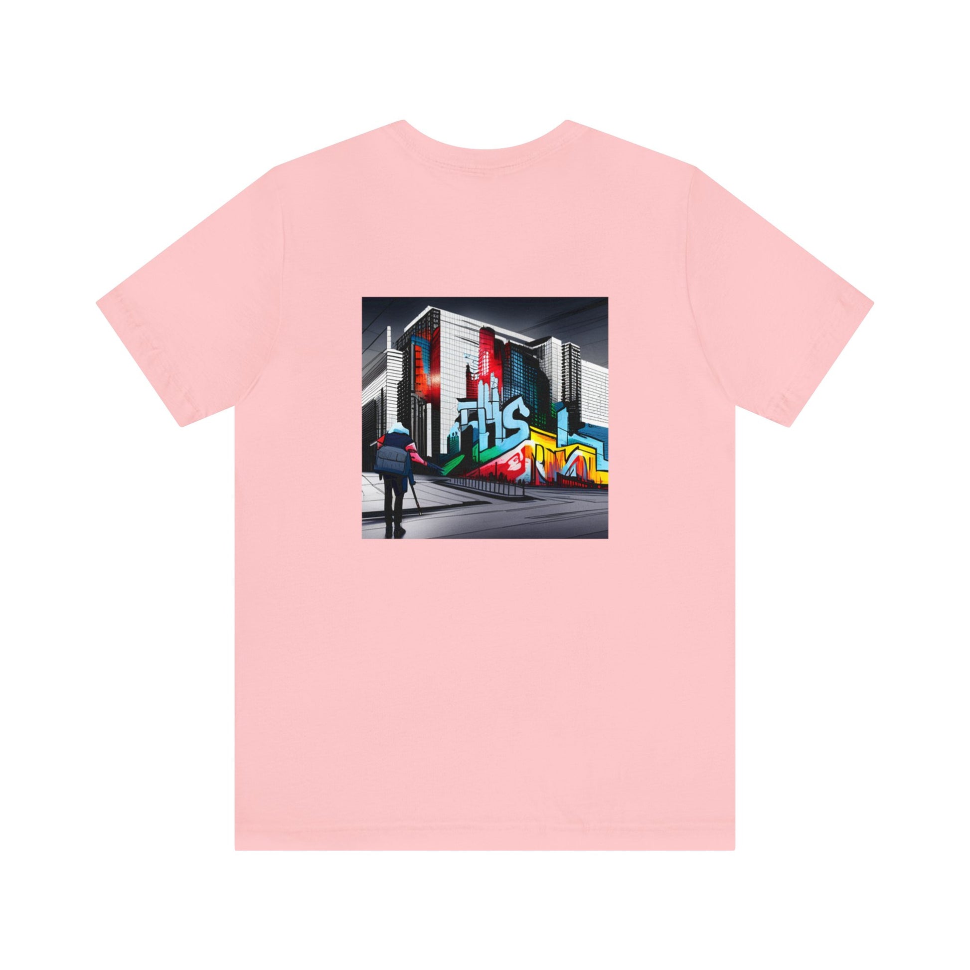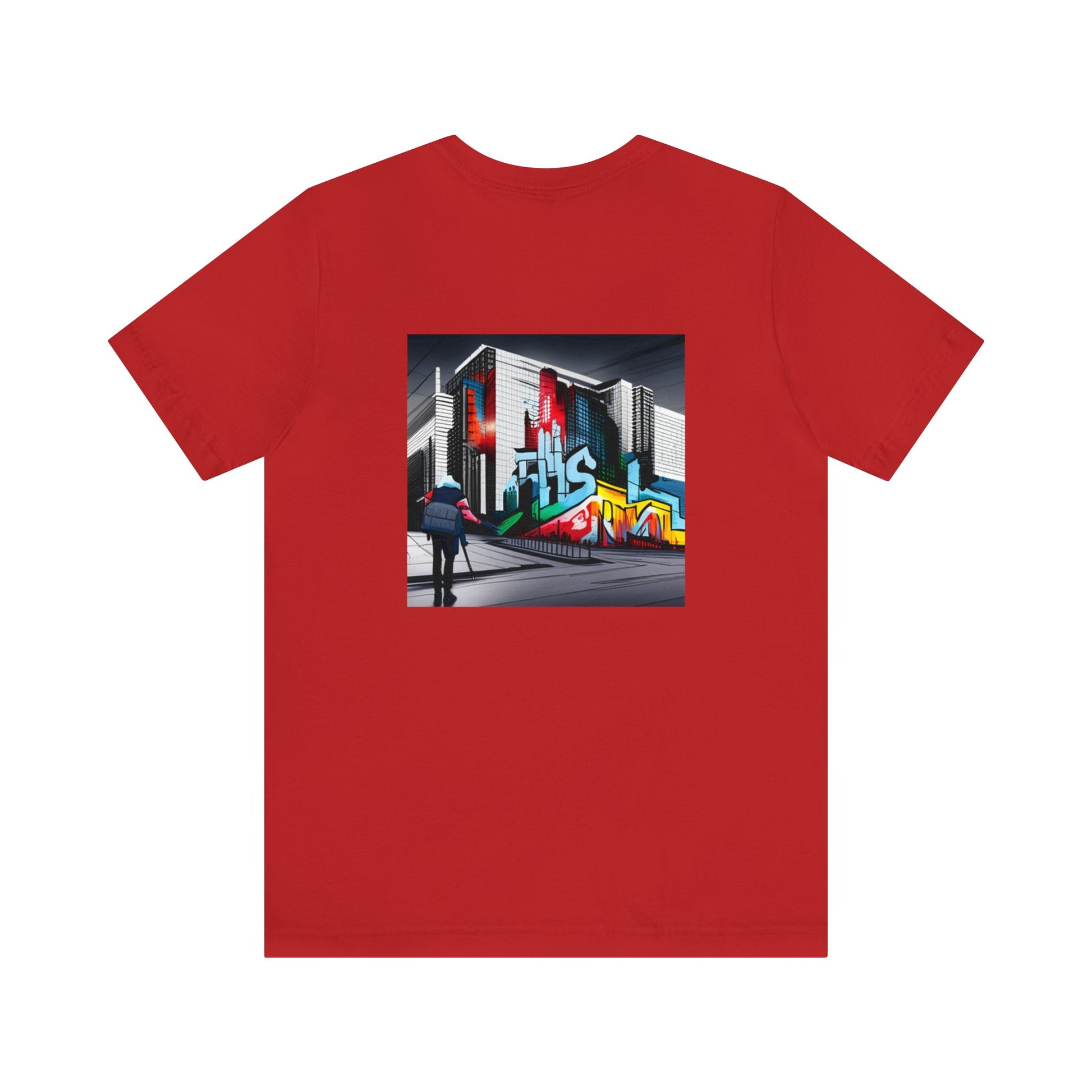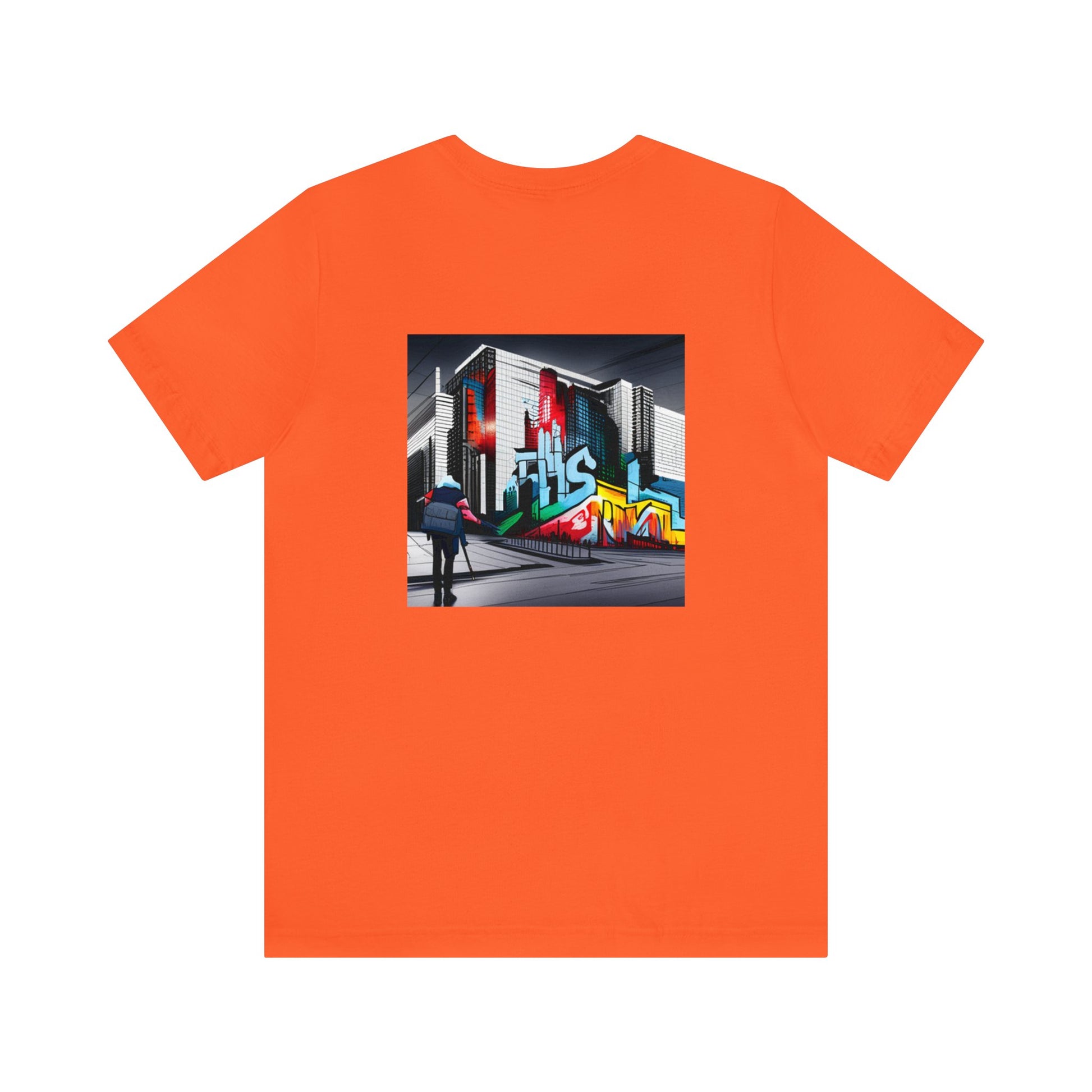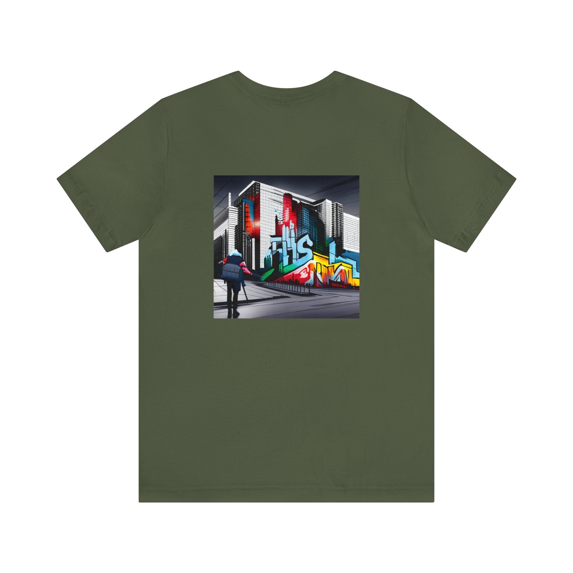 Normal Shirt with AI graffiti on buildings. Futurisitc scene.