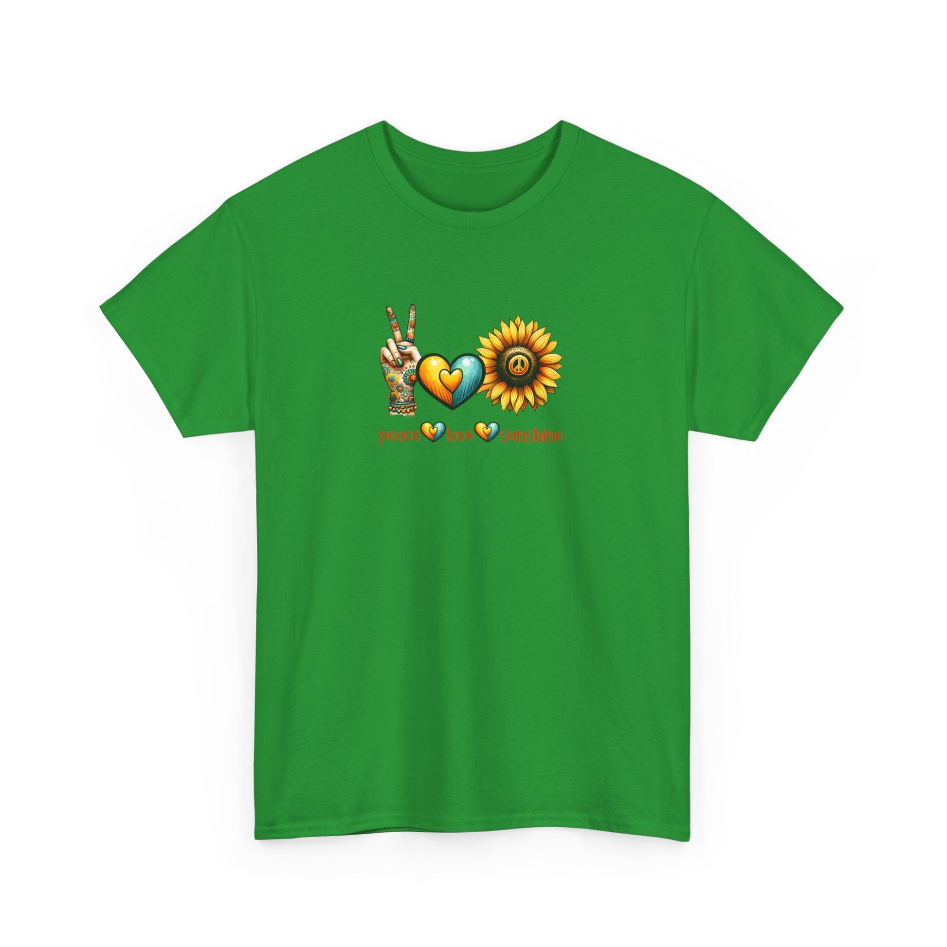 Celebrate peace and positivity with this Unisex Heavy Cotton Tee, perfect for spreading good vibes in any setting. The eye-catching design featuring a playful combination of peace symbols and sunflowers creates a warm and inviting atmosphere. Ideal for casual outings, festivals, or days spent at the park, this tee embodies comfort and style. Whether you're lounging with friends or out and about, it's a versatile piece that resonates with those who cherish love and nature. A thoughtful gift for friends, family, and anyone who embraces a free-spirited lifestyle, it’s also perfect for Earth Day, summer gatherings, or just as a cheerful wardrobe staple.