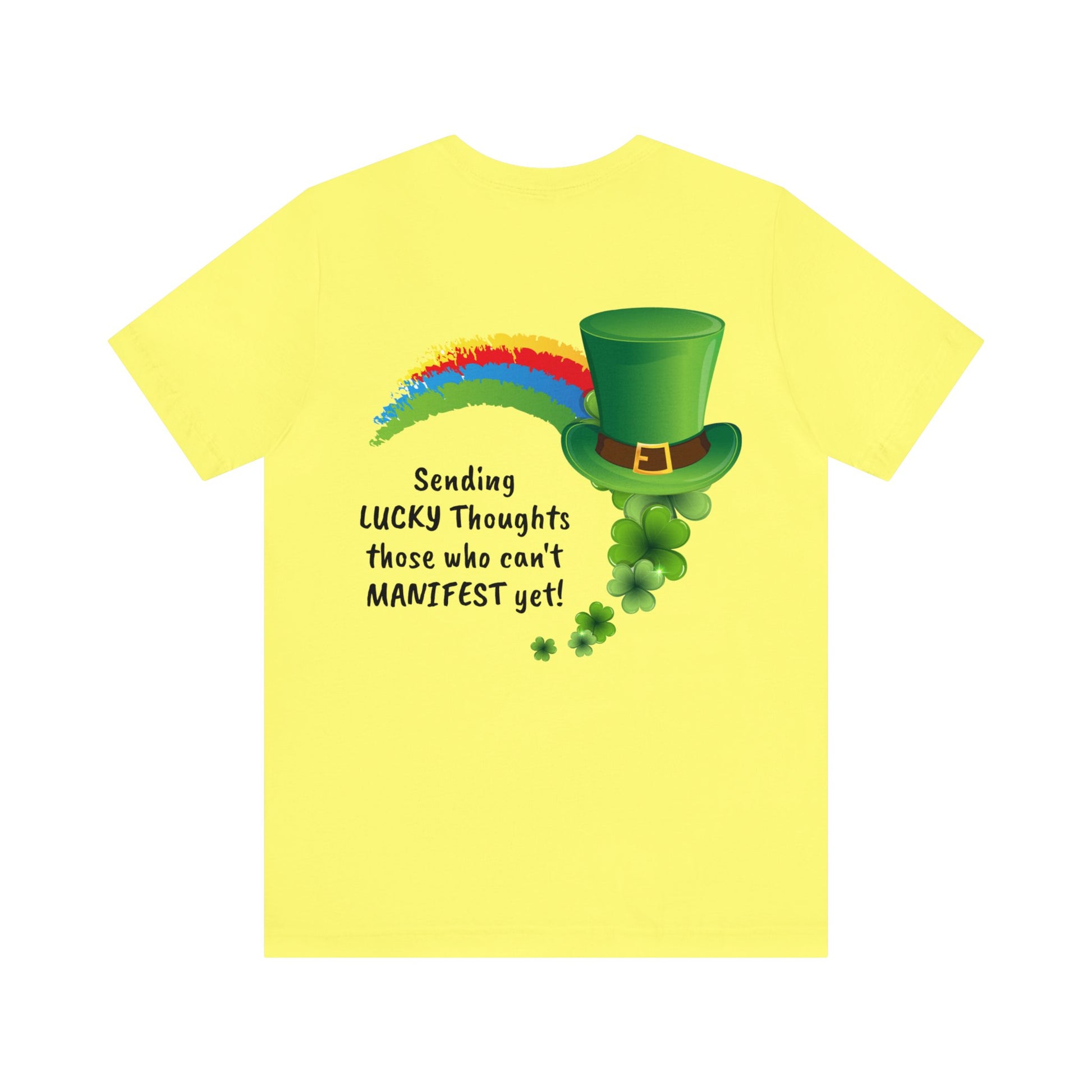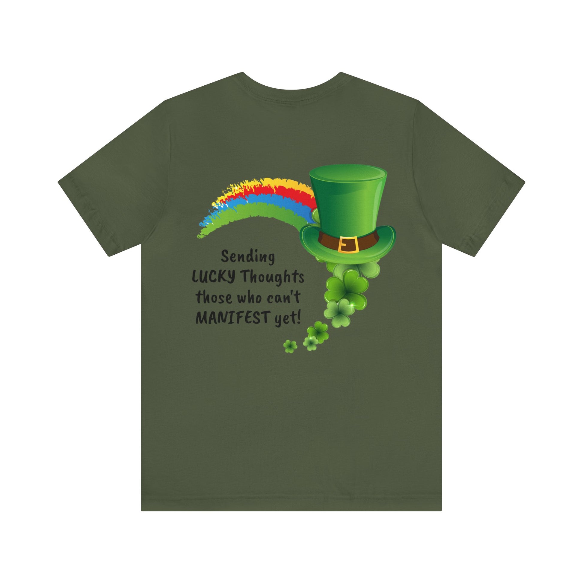 Clover on front with a saying and clover desing on back with sending luck for those who cant manifest yet.